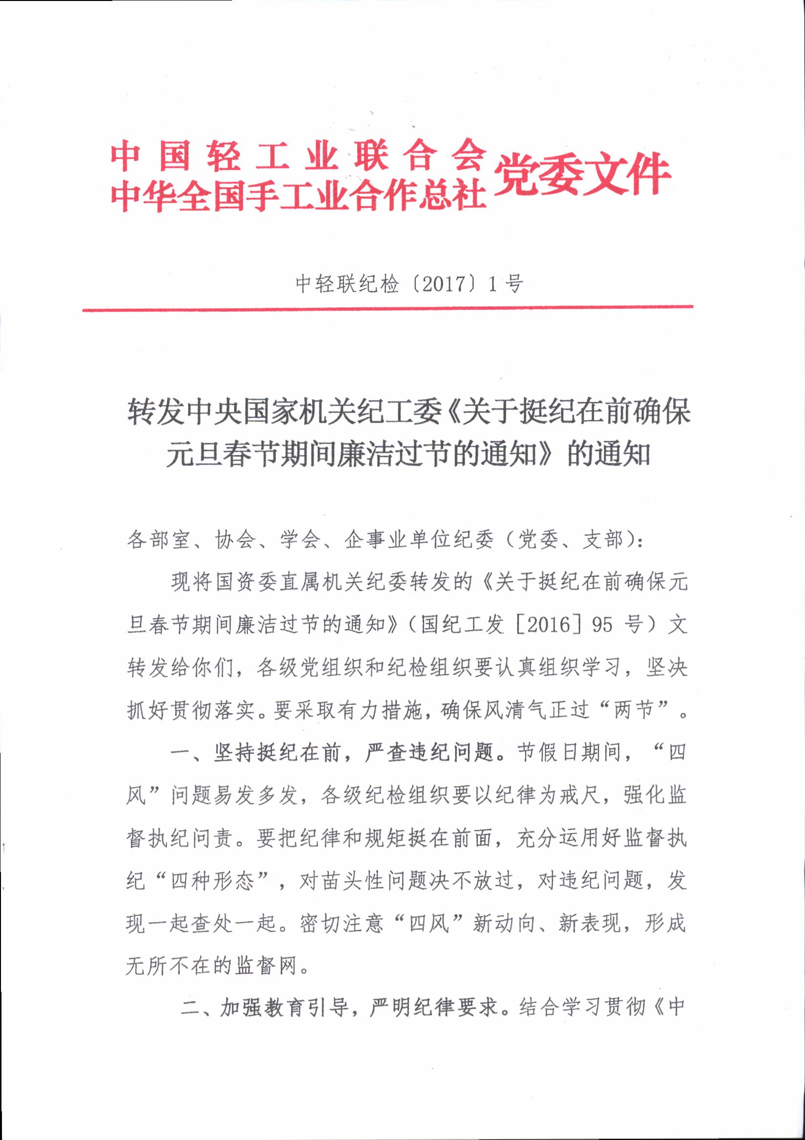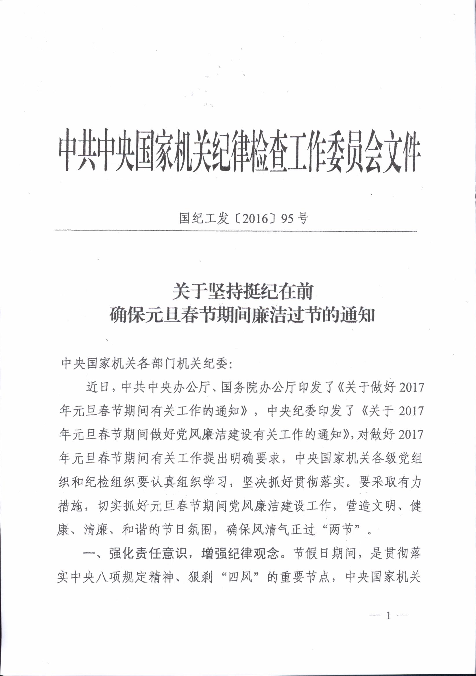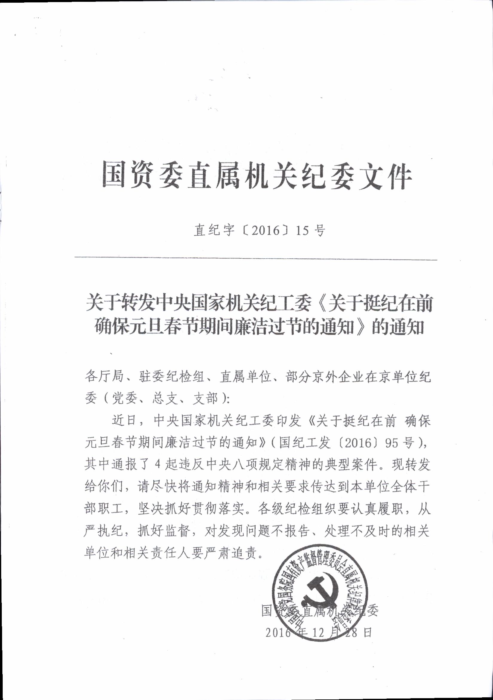 转发中央国家机关纪工委《关于挺纪在前确保元旦春节期间廉洁过节的通知》的通知