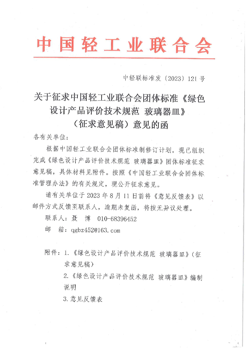 关于征求bv伟德国际体育1946团体标准《绿色设计产品评价技术规范 玻璃器皿》(征求意见稿)意见的函
