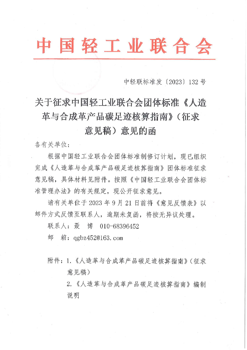 关于征求bv伟德国际体育1946团体标准《人造革与合成革产品碳足迹核算指南》(征求意见稿)意见的函