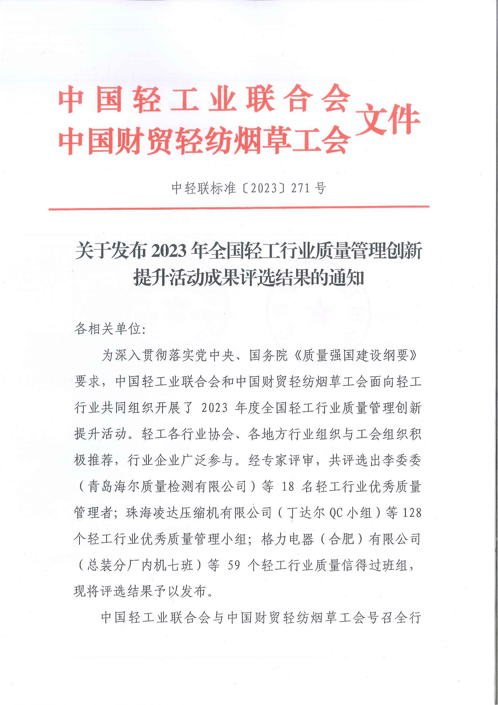 关于发布2023年全国轻工行业质量管理创新提升活动成果评选结果的通知
