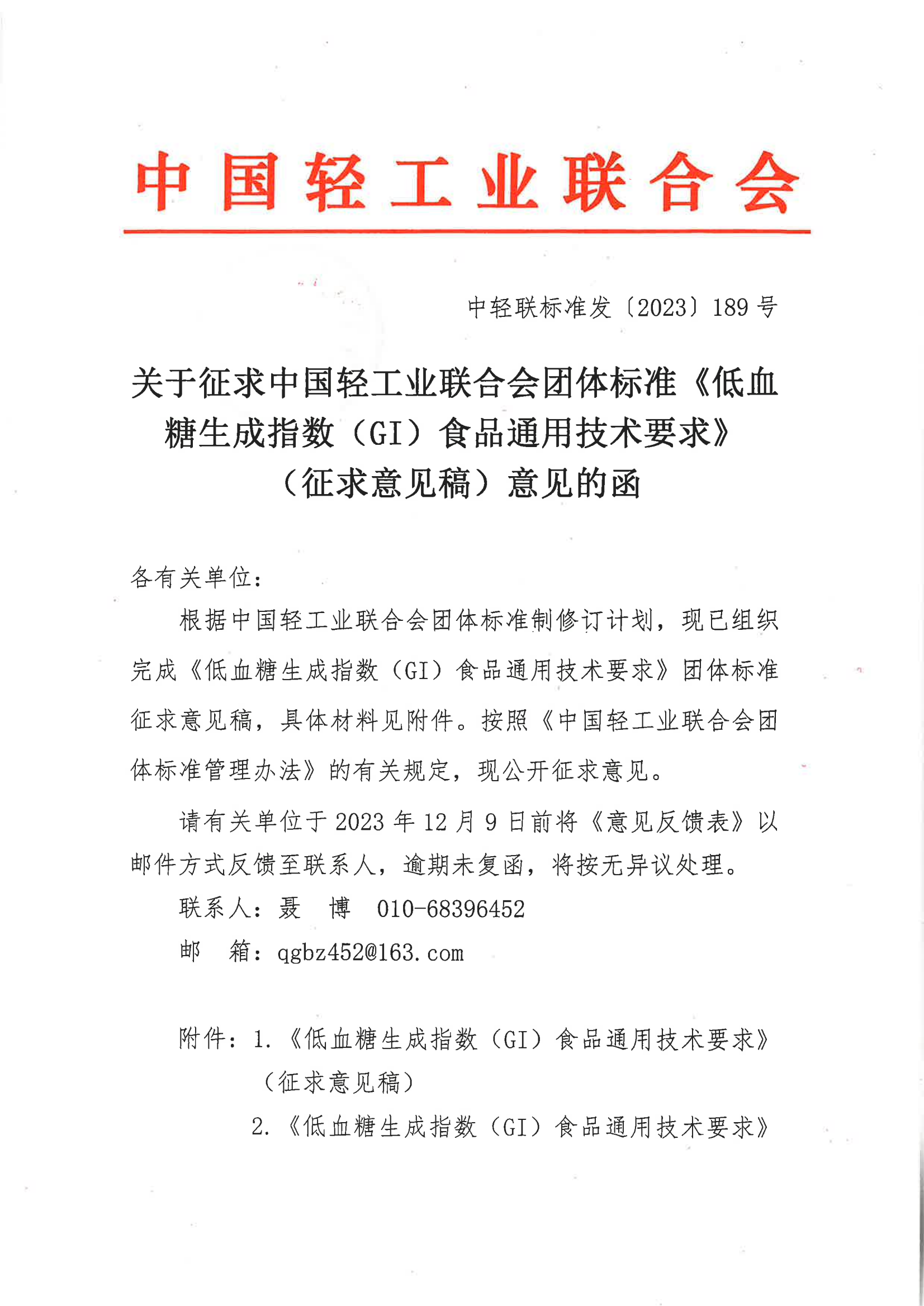 关于征求bv伟德国际体育1946团体标准《低血糖生产指数食品(GI)食品通用技术要求》(征求意见稿)意见的函