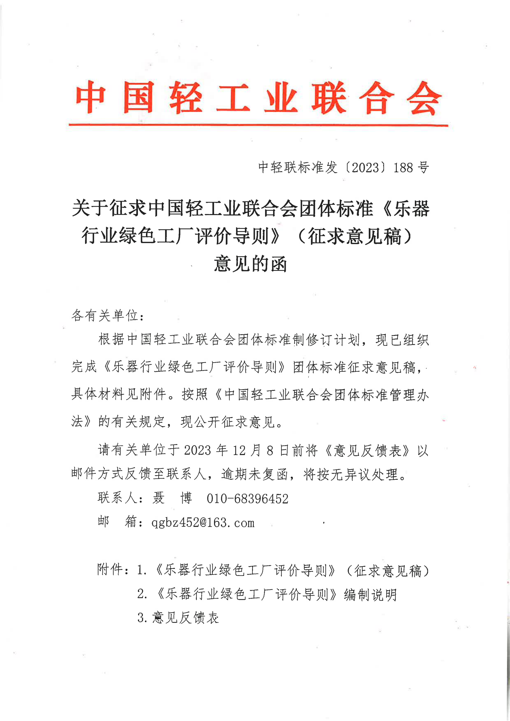 关于征求bv伟德国际体育1946团体标准《乐器行业绿色工厂评价导则》(征求意见稿)意见的函