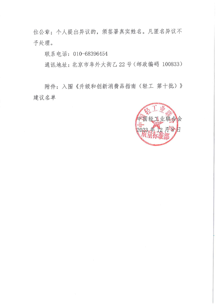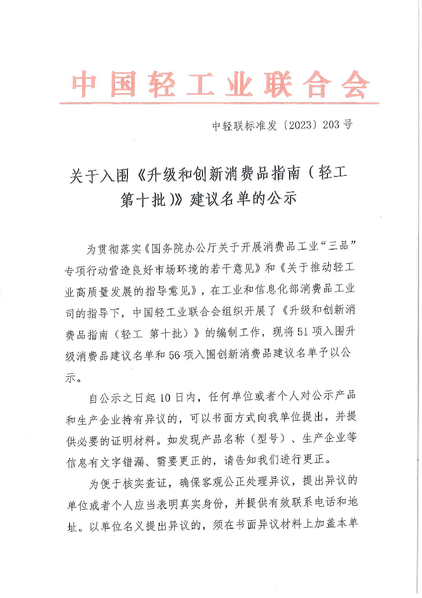 关于入围《升级和创新消费品指南(轻工 第十批)》建议名单的公示