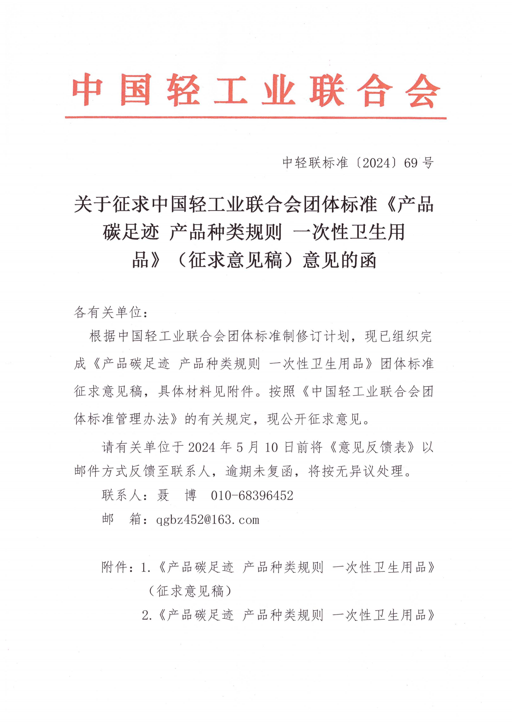 关于征求bv伟德国际体育1946团体标准《产品碳足迹 产品种类规则 一次性卫生用品》(征求意见稿)意见的函