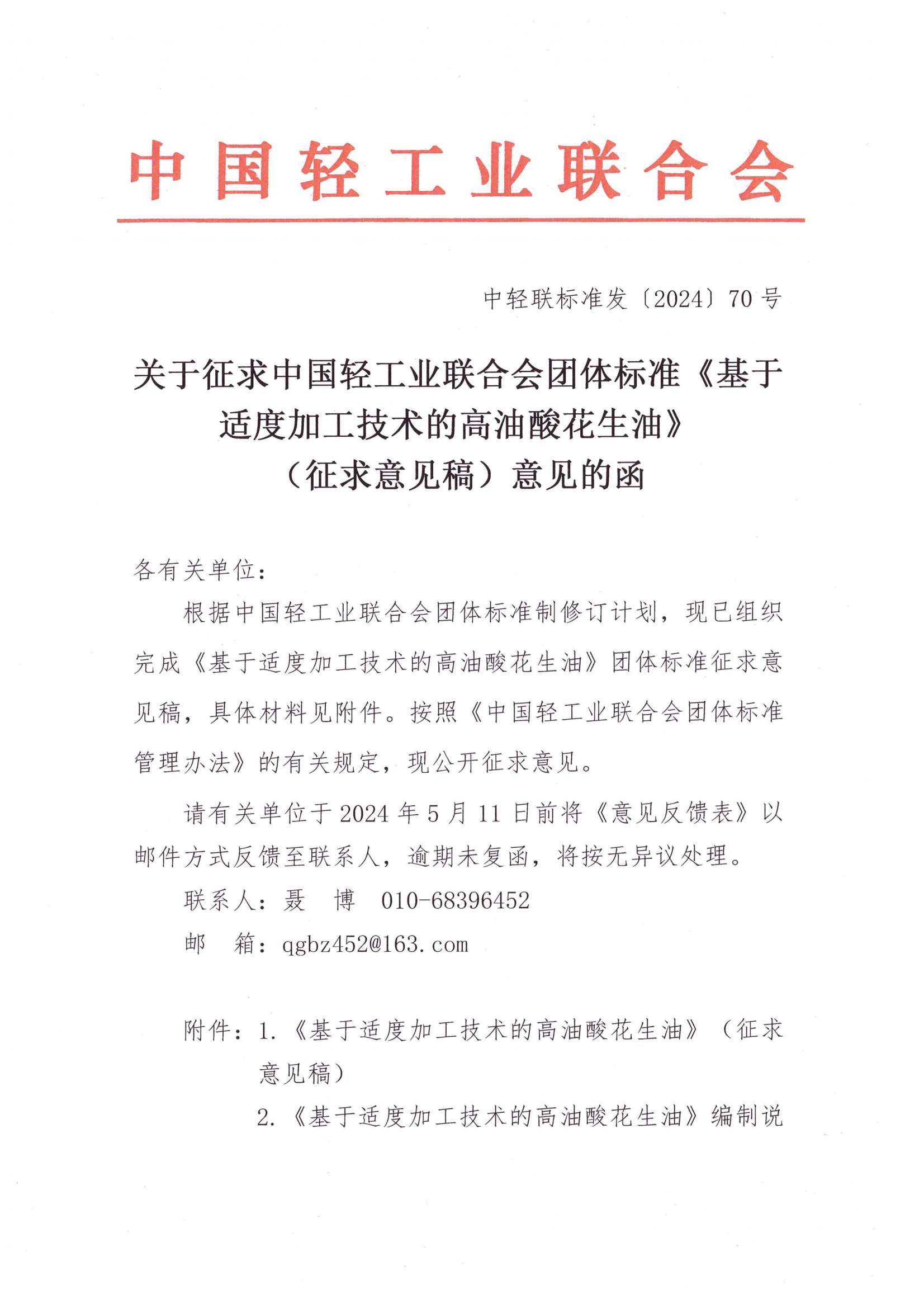 关于征求bv伟德国际体育1946团体标准《基于适度加工技术的高油酸花生油》(征求意见稿)意见的函