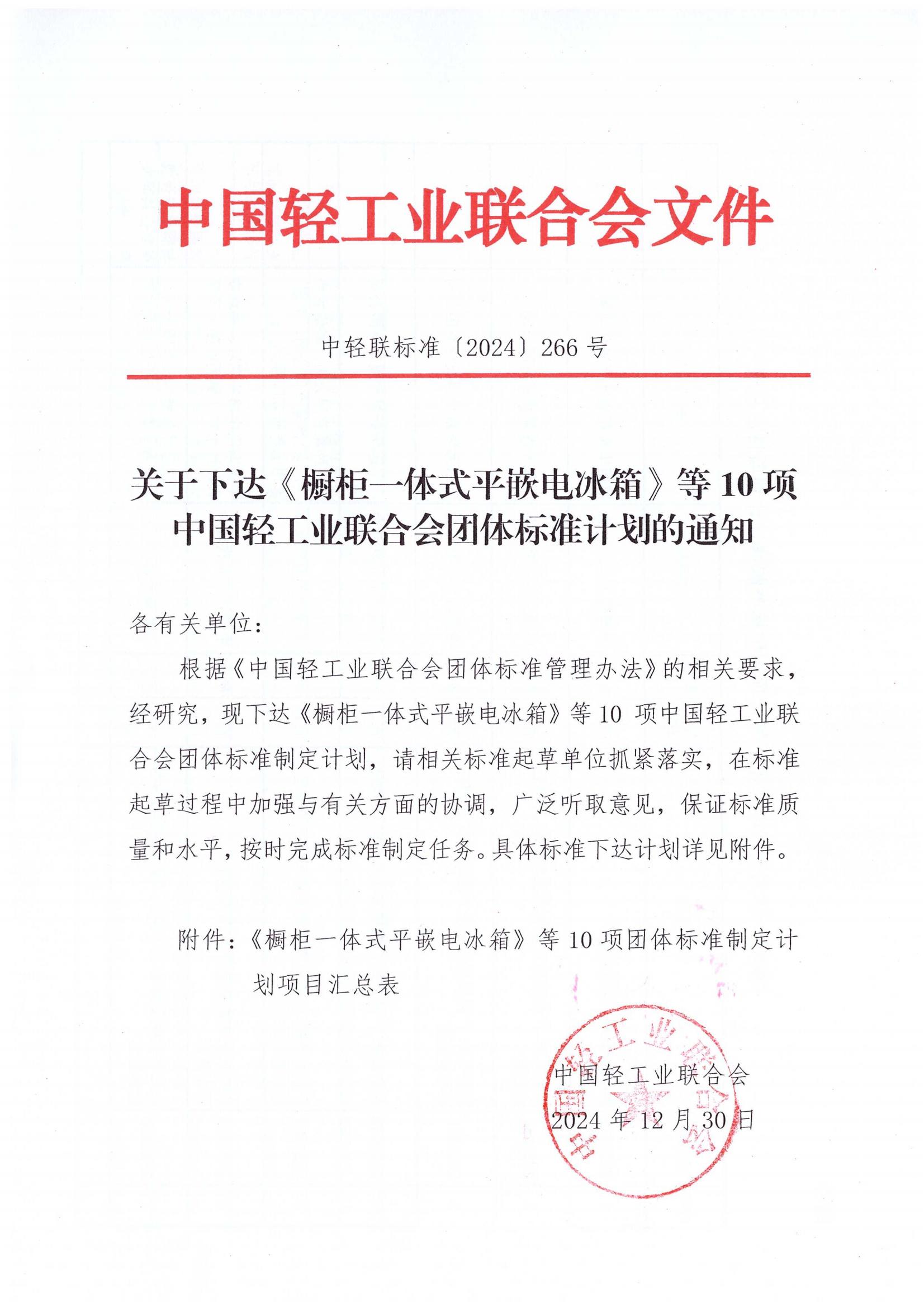 关于下达《橱柜一体式平嵌电冰箱》等10项bv伟德国际体育1946团体标准计划的通知