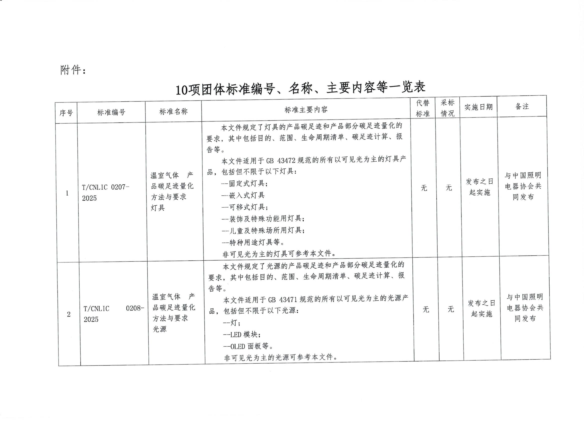 关于批准发布《温室气体产品碳足迹量化方法与要求灯具》等10项团体标准的公告