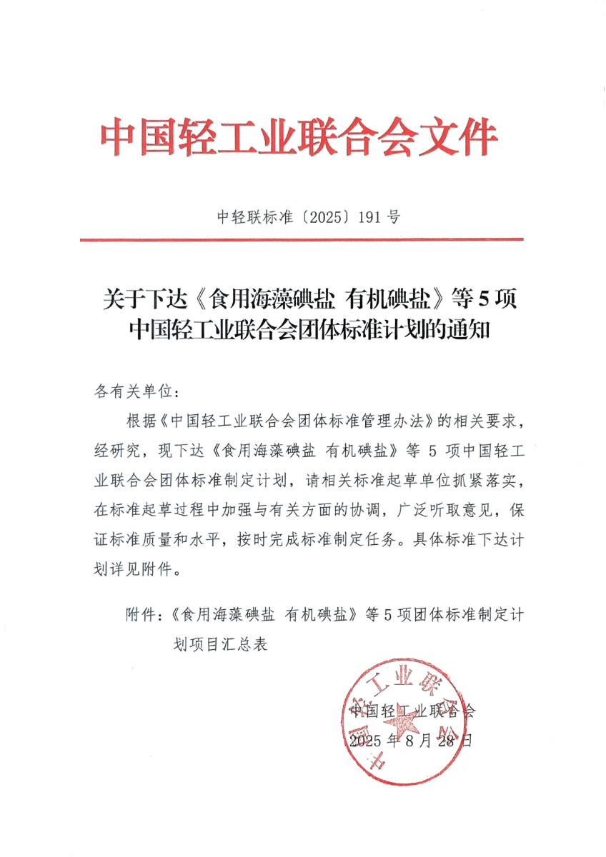 关于下达《食用海藻碘盐 有机碘盐》等5项bv伟德国际体育1946团体标准计划的通知