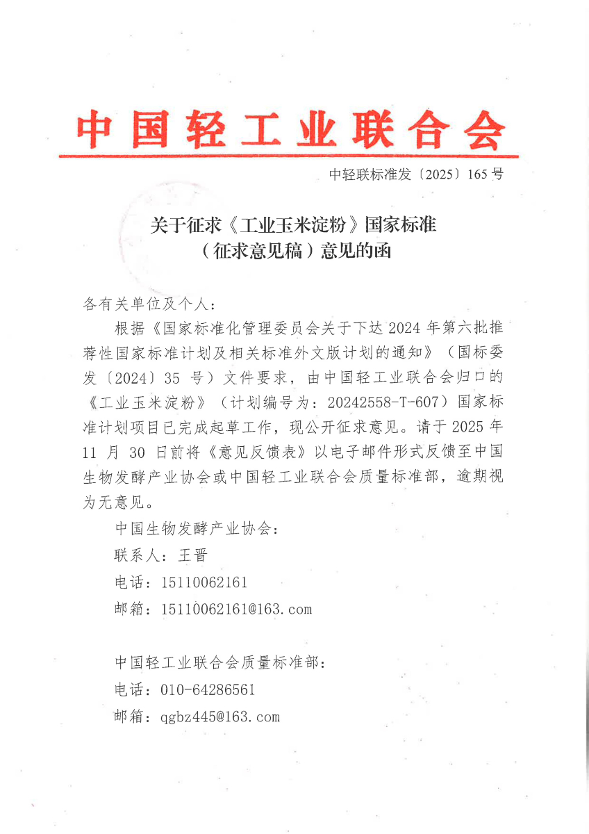 关于征求《工业玉米淀粉》国家标准 (征求意见稿)意见的函