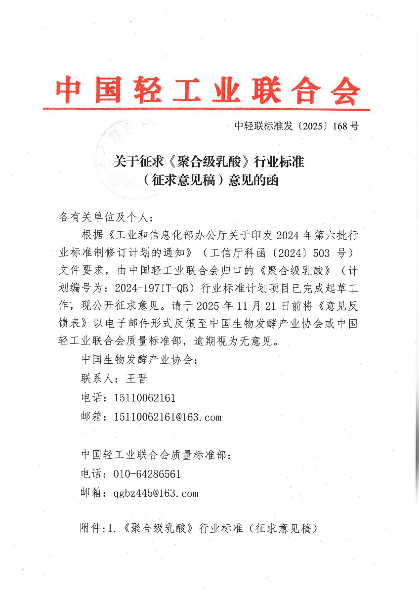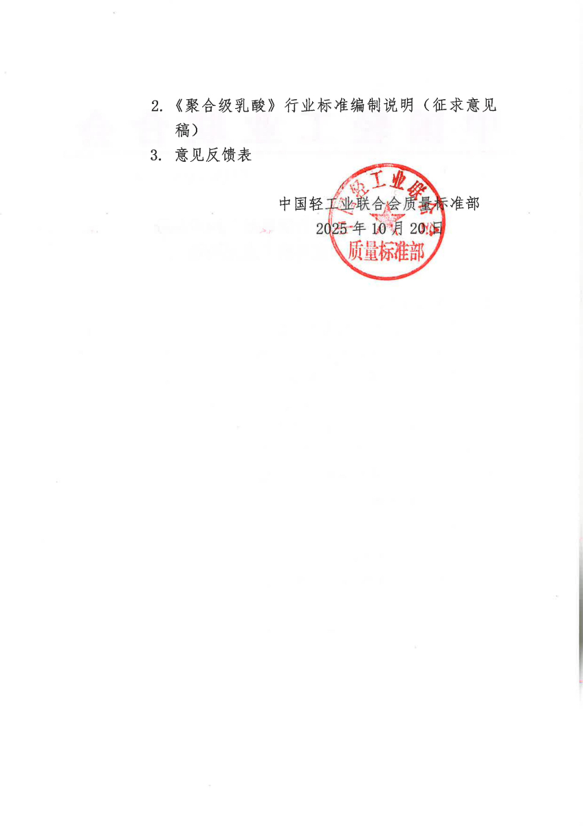 关于征求《聚合级乳酸》行业标准(征求意见稿)意见的函