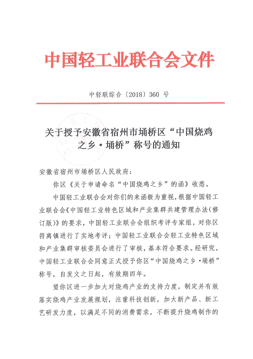 关于授予安徽省宿州市埇桥区“中国烧鸡之乡·埇桥”称号的通知