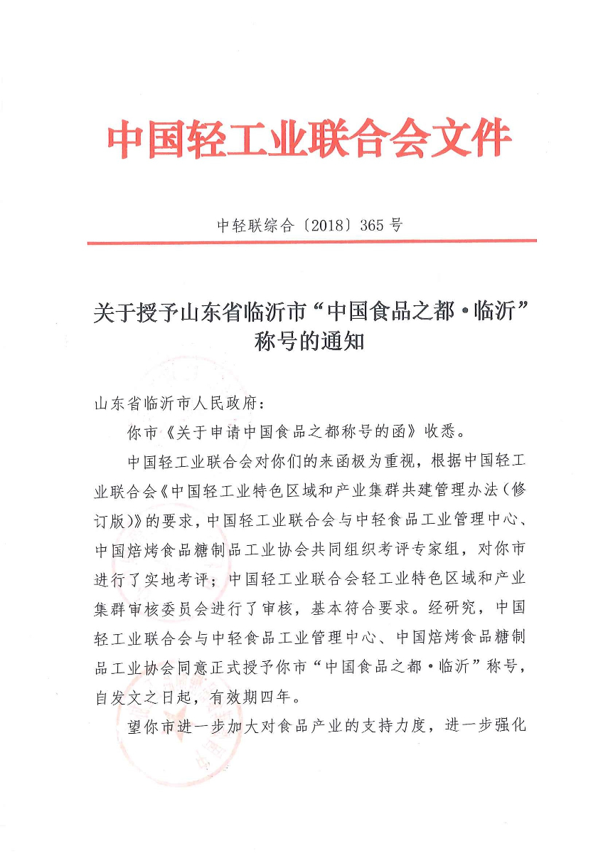 关于授予山东省临沂市“中国食品之都·临沂”称号的通知