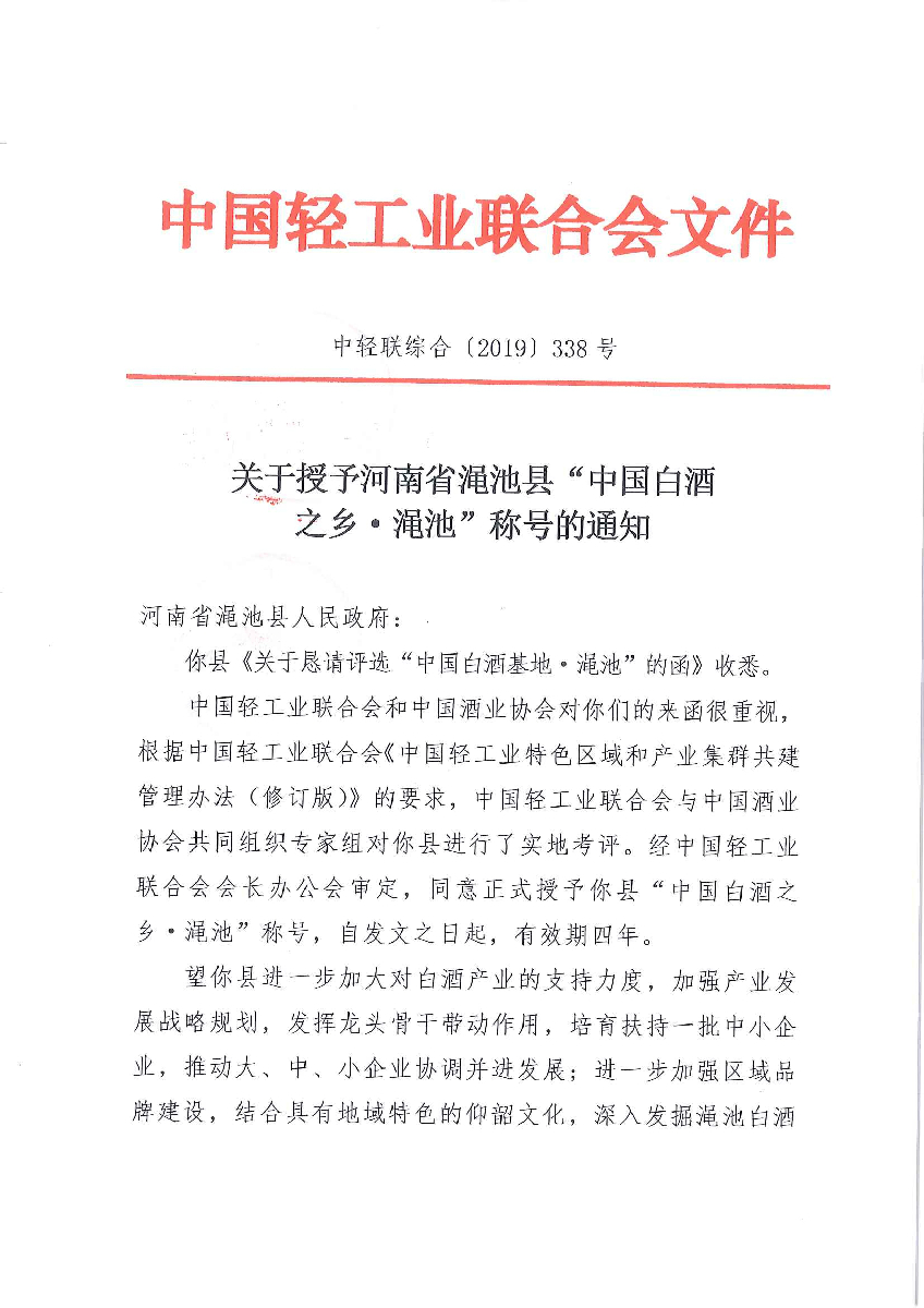 关于授予河南省渑池县“中国白酒之乡·渑池”称号的通知