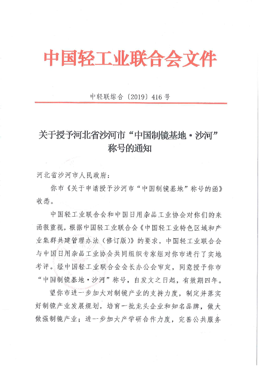 关于授予河北省沙河市“中国制镜基地·沙河”称号的通知