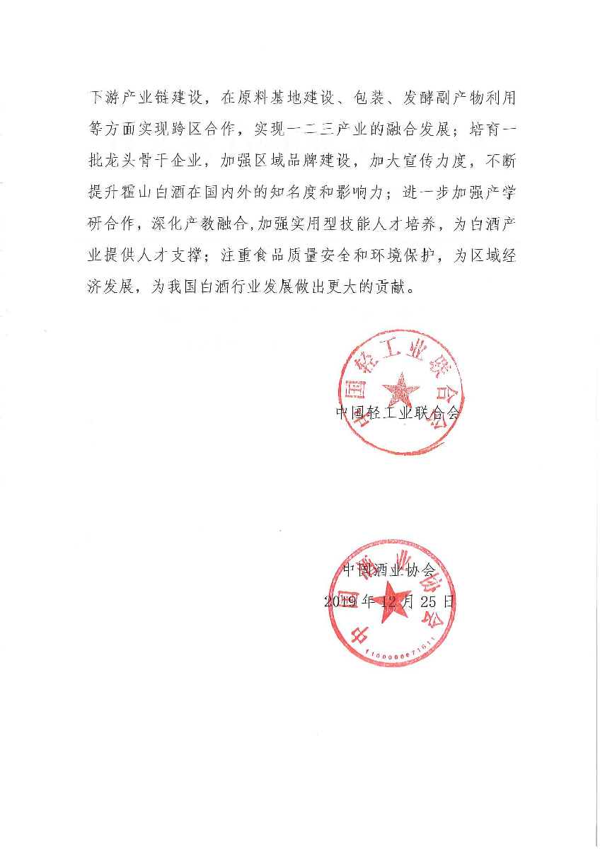 关于授予安徽省六安市霍山县“中国白酒之乡·霍山”称号的通知