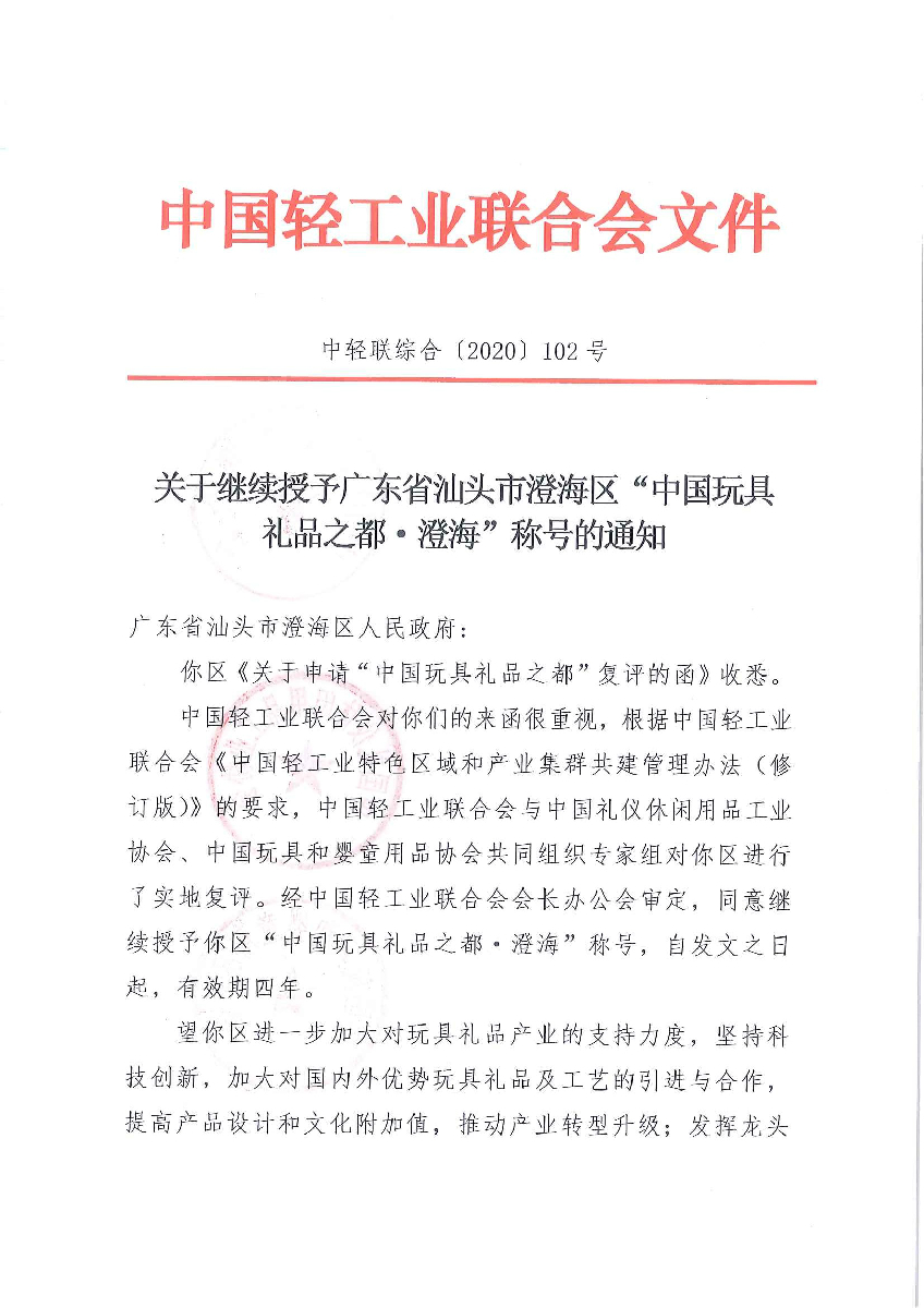 关于继续授予广东省汕头市澄海区“中国玩具礼品之都·澄海”称号的通知
