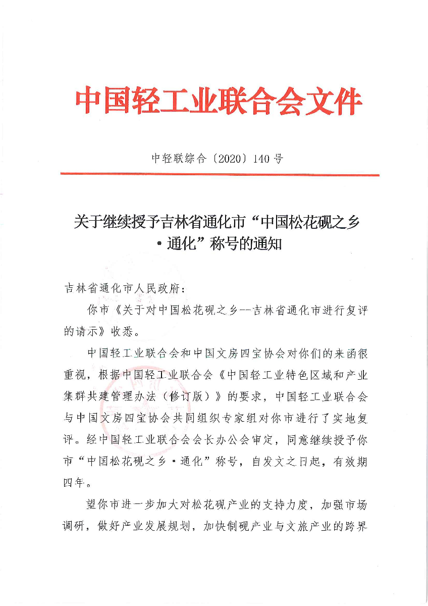 关于继续授予吉林省通化市“中国松花砚之乡·通化”称号的通知