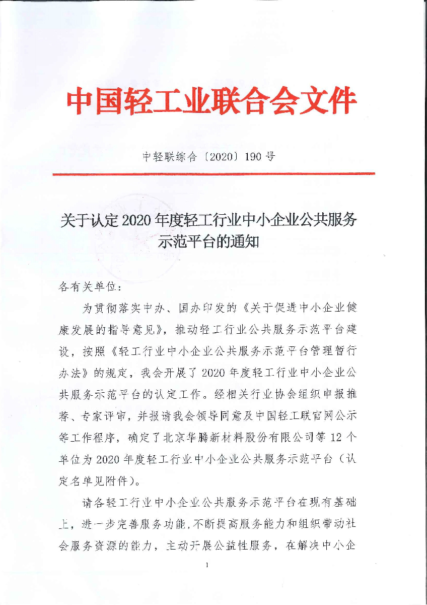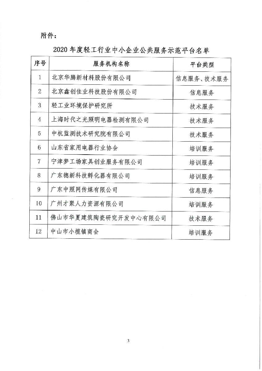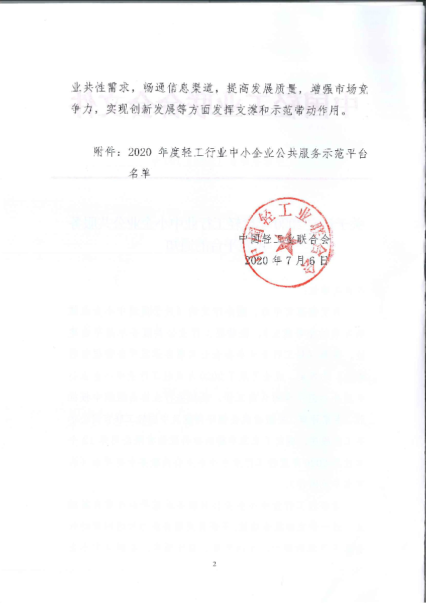 关于认定2020年度轻工行业中小企业公共服务示范平台的通知
