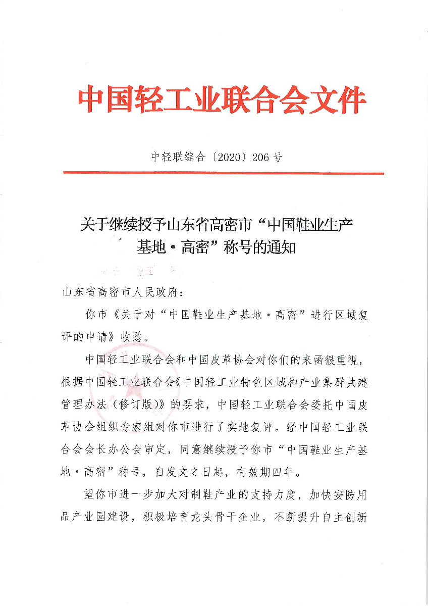 关于继续授予山东省高密市“中国鞋业生产基地·高密”称号的通知