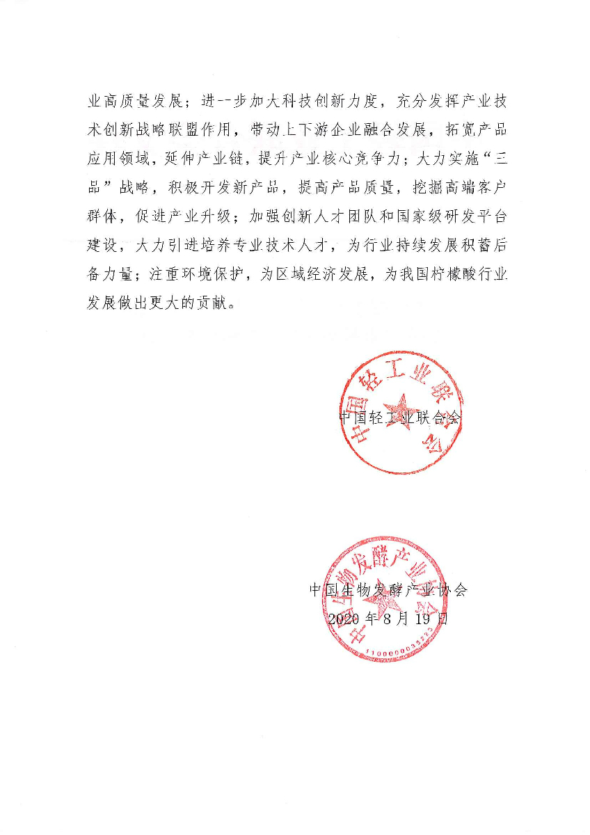关于继续授予山东省昌乐县“中国柠檬酸特色产业基地·昌乐”称号的通知