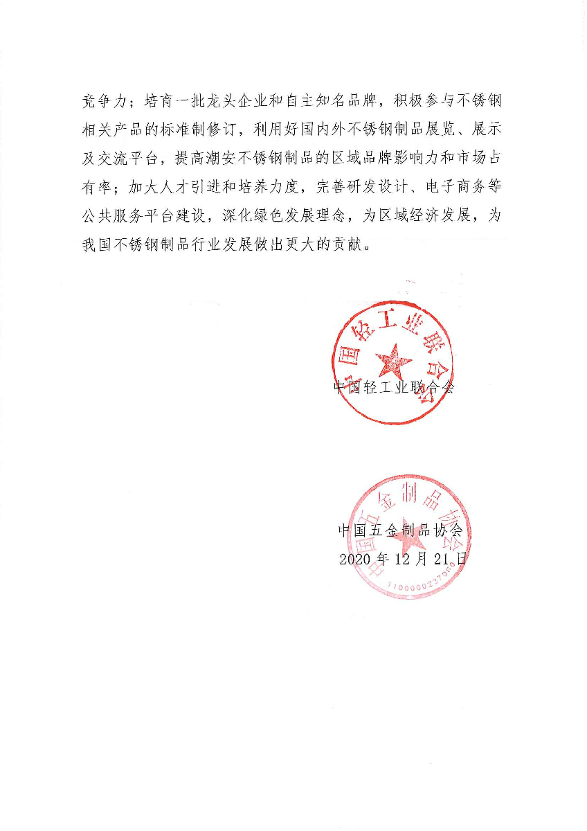 关于授予广东省潮州市潮安区“中国五金不锈钢制品产业基地·潮安”称号的通知