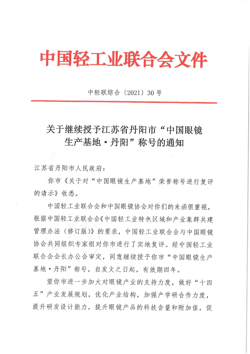 关于继续授予江苏省丹阳市“中国眼镜生产基地·丹阳”称号的通知