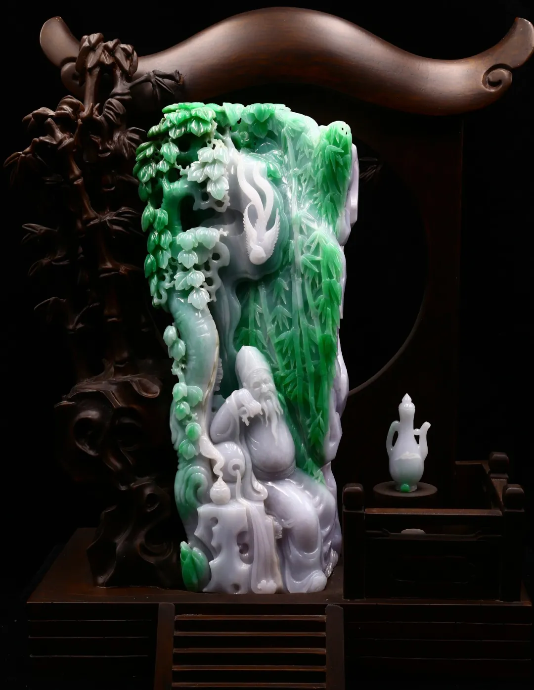作品采用翡翠水石料,利用圆雕、镂空雕技艺,俏色巧雕,丰富了画面的层次,充满动感。渔翁身背斗笠,手持烟斗,盘腿而坐,鱼鹰俯卧其上,鱼跃出水,呈现出悠然的水边美景。