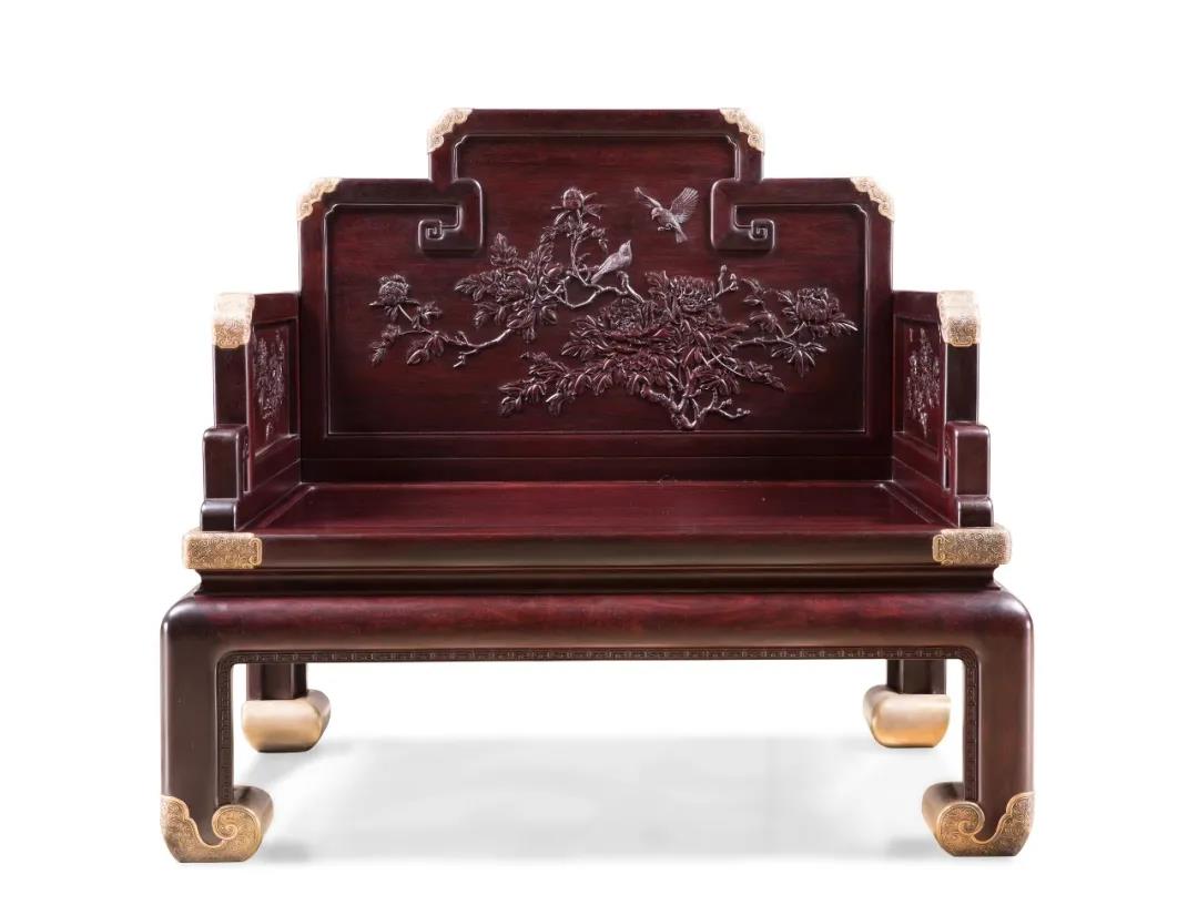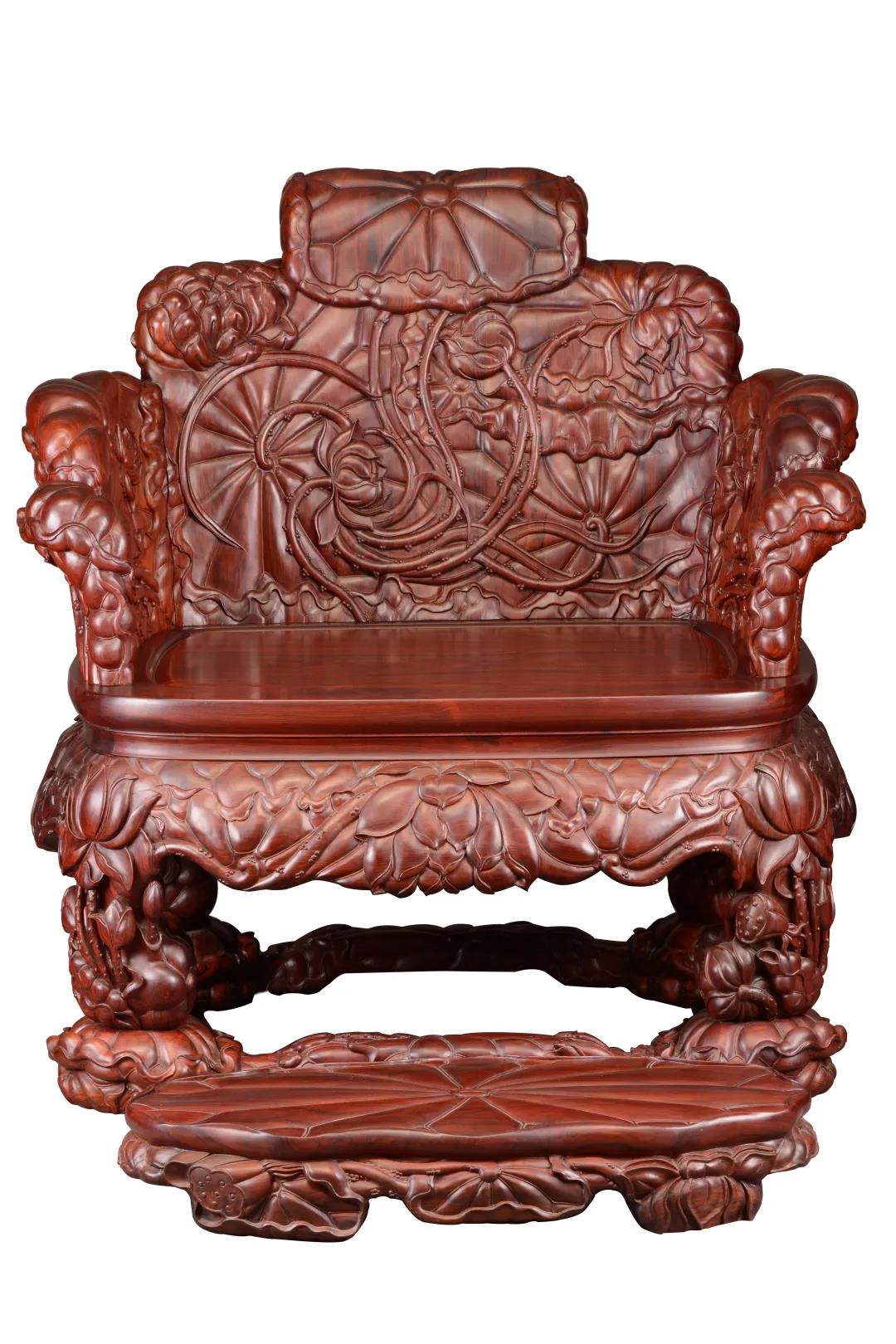 作品臻选大叶紫檀,整体以荷为形,人坐其上,仿入荷塘。花叶翩跹,具装饰性;水波潋艳,富艺术美。束腰带托泥,满雕荷花图;围子分三扇,化作七屏风。座面以外,满身浮雕,深浅融合,工精艺巧。背板花叶穿插变化,构思精巧,藏露得宜,雕工深入浅出,流畅圆浑。
