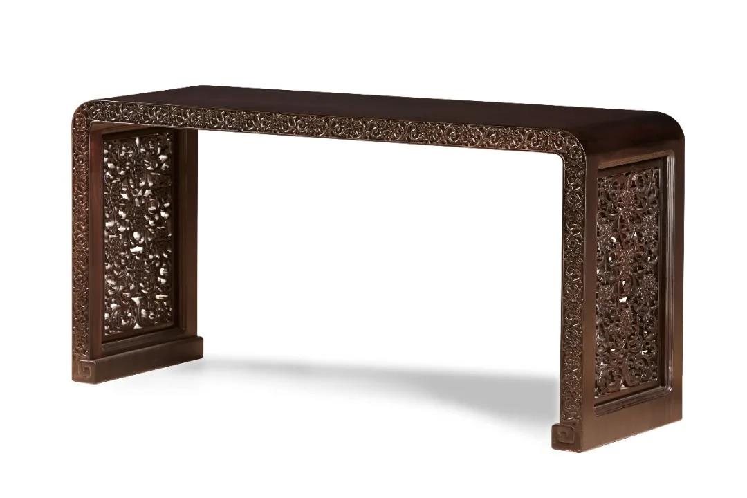 黄福华大师继承了明清以来传统的古典家具制作工艺,融合了现代艺术设计理念,不仅有传统吉祥文化图案,还与时俱进融入时代元素,构思巧妙,古韵今风。黄大师集平雕、圆雕、浮雕、浅雕、阴雕、透雕等多种雕刻技法于一器,造型结构简练严谨,形态雕饰含韵藏神,“型、材、艺、韵”和谐统一,形成了“制式独特、连结巧妙、雕镂细腻、意韵深厚”的艺术风格。