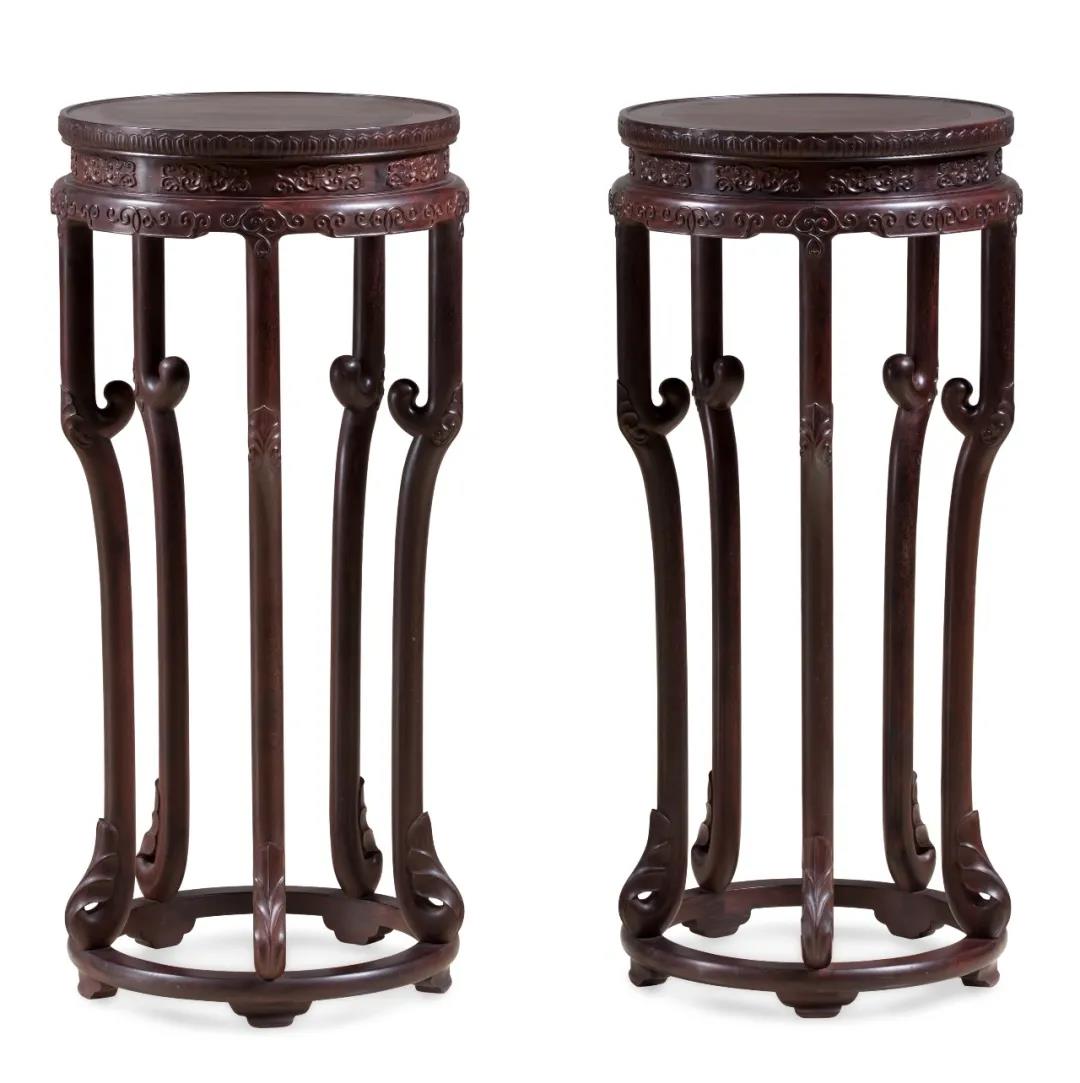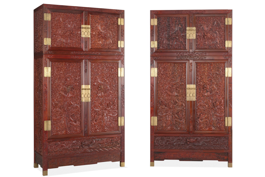 作品优选交趾黄檀,形制高大,肃穆庄重,由顶柜和底柜组成,一左一右,成双成对。正面及侧面满雕云龙,或为祥龙驾云,九天腾日,昂首摆尾,出云入岫;或为双龙戏珠,威武雄壮,姿意翻滚,动感十足。