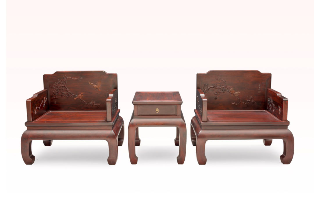 作品臻选交趾黄檀,精工打造而成。造型素雅清秀,匀称协调,挺拔秀丽;线条简洁流畅,刚柔相济,质朴大方。靠背板和左右侧板,浅浮雕工笔花鸟国画,以刀代笔,收放自如,鸟雀栩栩如生,羽毛丝毫毕现,形态逼真,跃然案上。座面攒框镶心,落膛安腰,鼓腿彭牙,内翻马蹄。整件作品结构严谨,做工精细,舒展稳重,温婉大气。