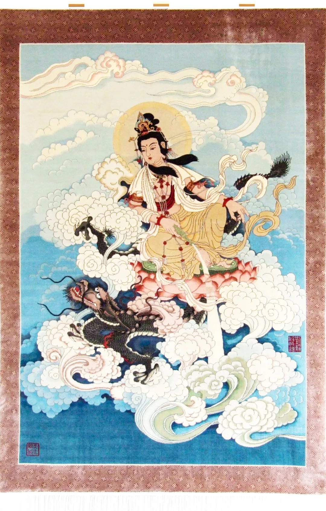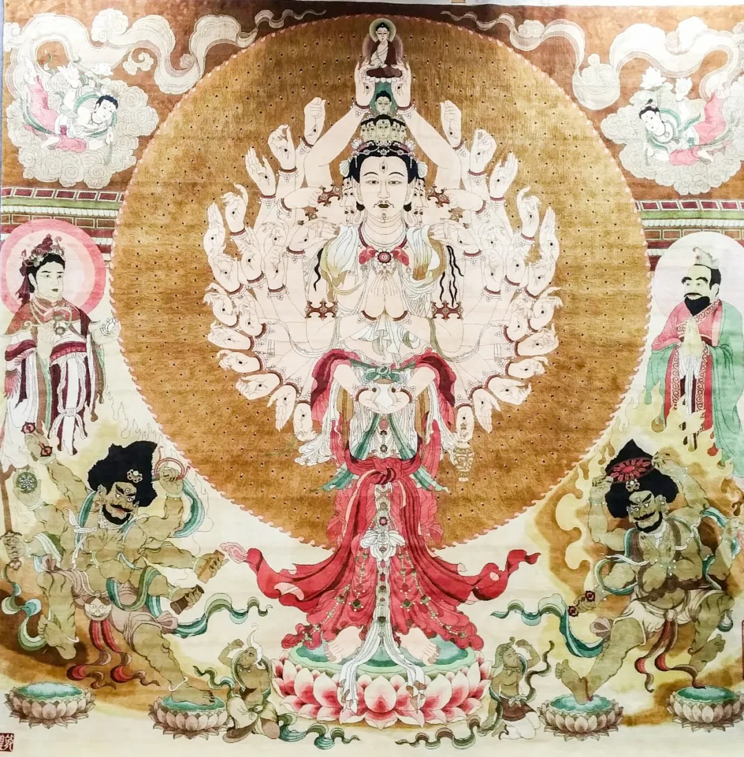 作品根据莫高窟第3窟元代壁画,采用60支天然桑绢丝为原料,经200道手工编织“8”字型抽绞裁绒工艺设计制作而成。所绘观音三眼,双手高举化佛,千手中各有一眼,持宝瓶,柳枝立莲台上,其左下婆薮仙作婆罗门老人形,右下功德天作贵妇盛装,上有飞天散花,下部左右各有六臂金刚神护法。挂毯在编织过程中运用了润色新工艺,底色和部分衣纹等纹样做了色线与色线之间润色工艺,色彩丰富而又统一协调,更具艺术魅力。