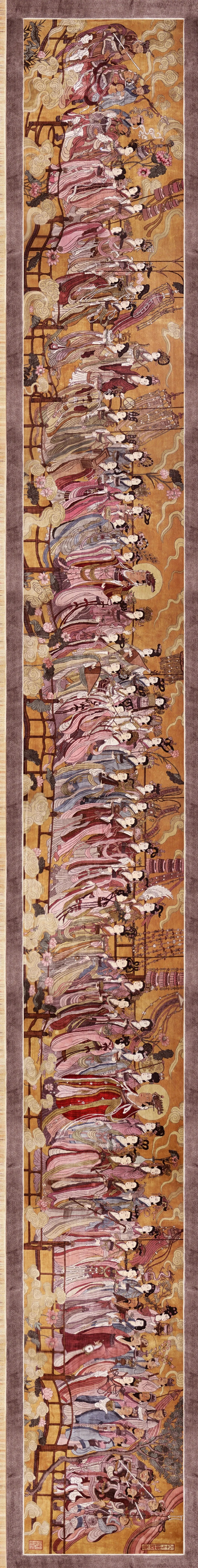 作品(规格:1230cm×150cm)根据古代名画《八十七神卷》再创作设计制作而成。设色精美典雅、古色古香。此图描绘了南极天帝君率领金童、玉女、神王、力士共87位神仙同去朝觐元始天尊的情景,场面宏大,人物众多,姿态和谐统一,似真似幻、似天界又似人间,构成了一个庄严、圣洁的神仙境界。