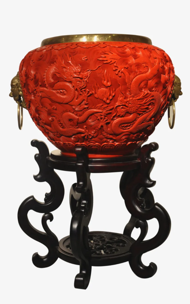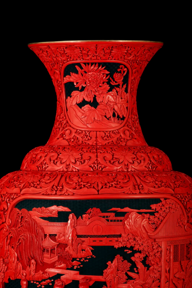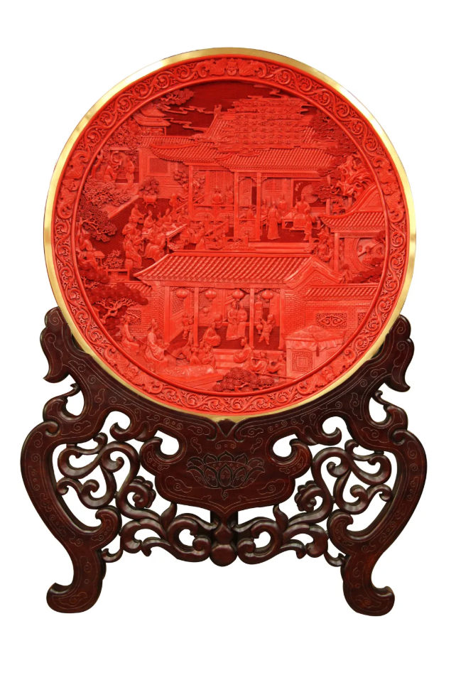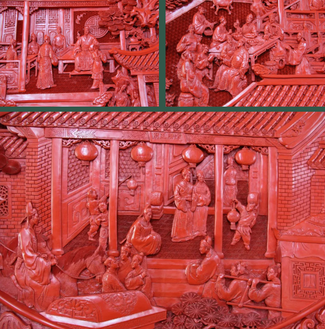 此作品为铜胎,胎上层层髹饰朱红色大漆,经数十道工序雕刻而成。作品刻画的是郭子仪拜寿的故事场景,人物众多、场面宏大,寓意吉祥。作品运用了高浮雕、深浮雕等多种现代高精尖的雕漆技法,层次分明、做工考究。作品人物形象多样,动静相宜,山石树木穿插其中,建筑雕刻立体感强,画面丰富自然、充实而又饱满。