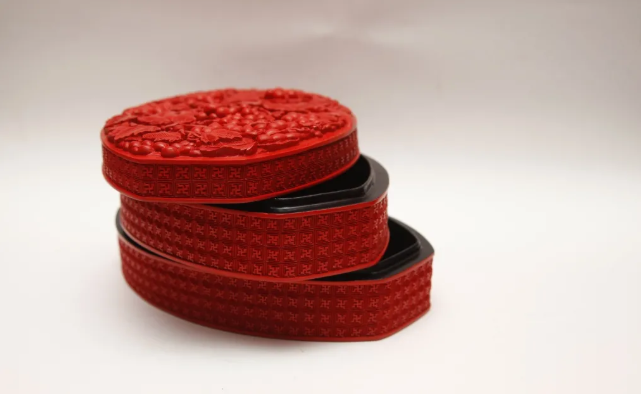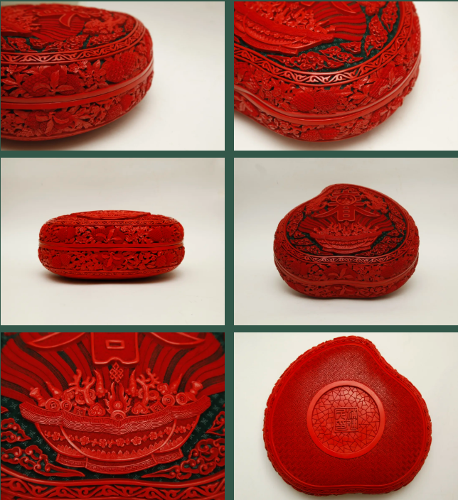 作品为铜胎,其上先后髹饰绿色和红色大漆制作而成。作品在传统圆形春字捧盒的基础上进行了大胆改良,用桃形器型凸显庆寿的主题,独具匠心。盒身通体雕刻寿桃纹,与器型交相辉映。寿桃上雕刻三尖、四方花、老虎爪、古禄钱等五十多种锦文,结构复杂严谨,雕工精巧细致,设计师古不泥。