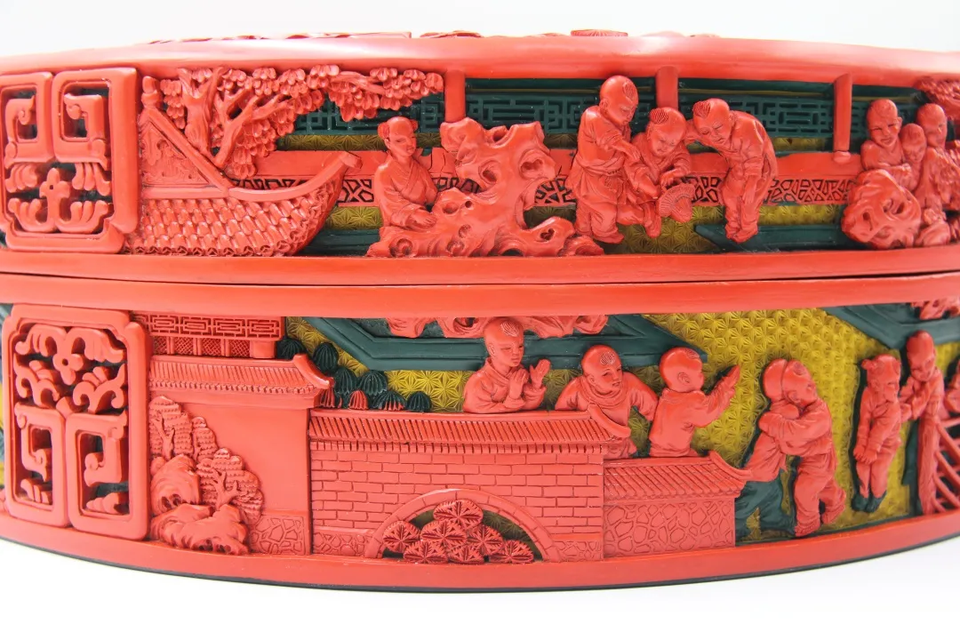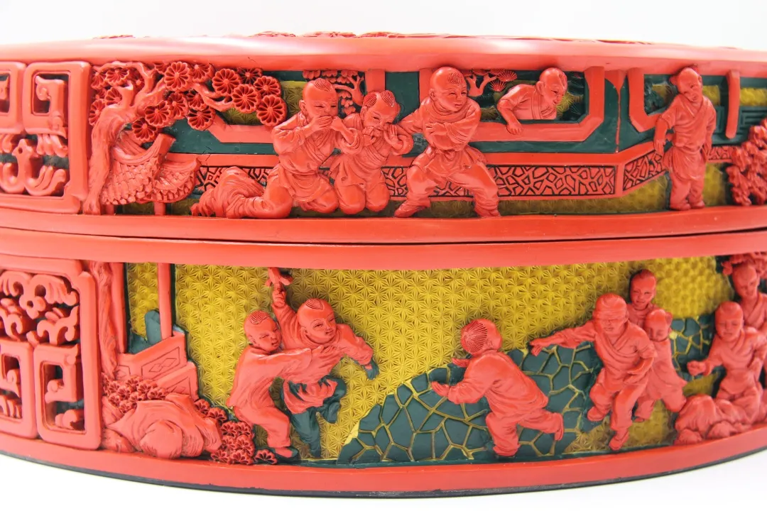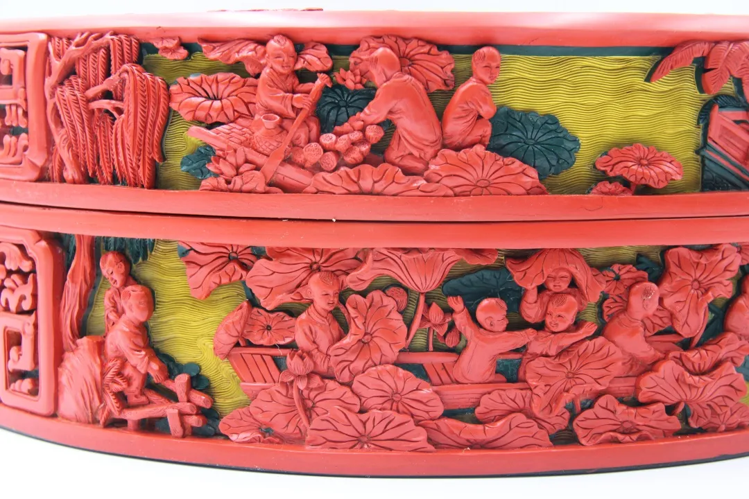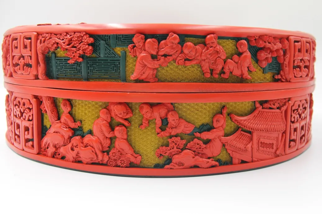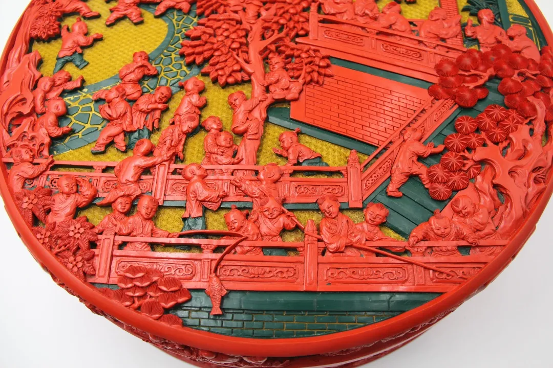此件作品为脱胎,上髹黄、绿、红三色大漆雕刻而成。主题为百子游春,盒盖上描绘庭院内孩童们嬉戏打闹、一同摘果子、钓鱼等生动的生活场景。作品中,台栏池沼高低错落,上下称景,孩童三五成组,相互呼应,远近关系处理得丰满而不拥塞,繁复而不杂乱,明确而有节奏。盒边上下对称分为四组小景,采莲、捉迷藏、对弈等游玩、嬉戏的动人场景,主题鲜明,相互呼应,协调统一。
