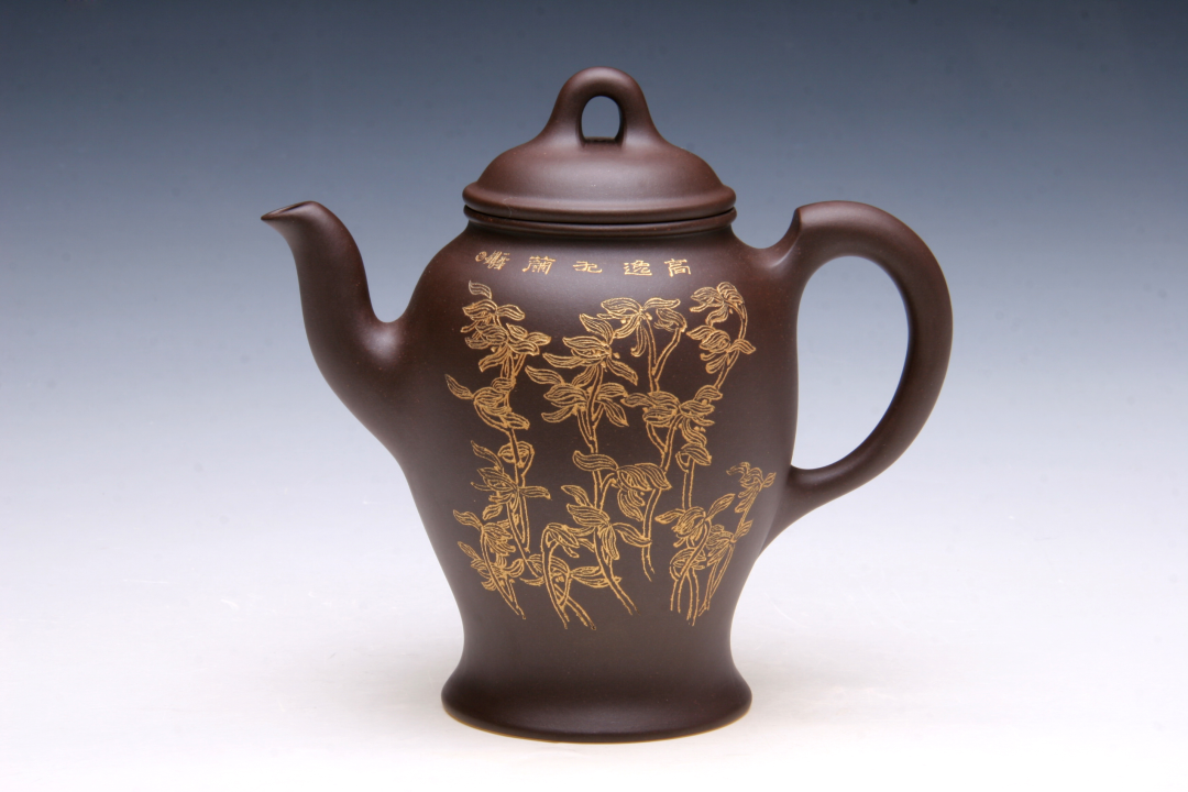 竹,有着不一般的中国传统文化含义,四季常青寓顽强生命,内心中空寓虚怀若谷,弯而不折寓柔中有刚,生而有节、竹节必露寓高风亮节。壶型和壶名丝丝入扣,壶型融入竹之精神,浑然一体。壶身正面刻绘山水,壶盖装饰以钟鼎文,集中国书法绘画之大成,刻绘铁划银钩,凝练古朴,神韵怡然,与“竹露生香”造型相映生辉。
