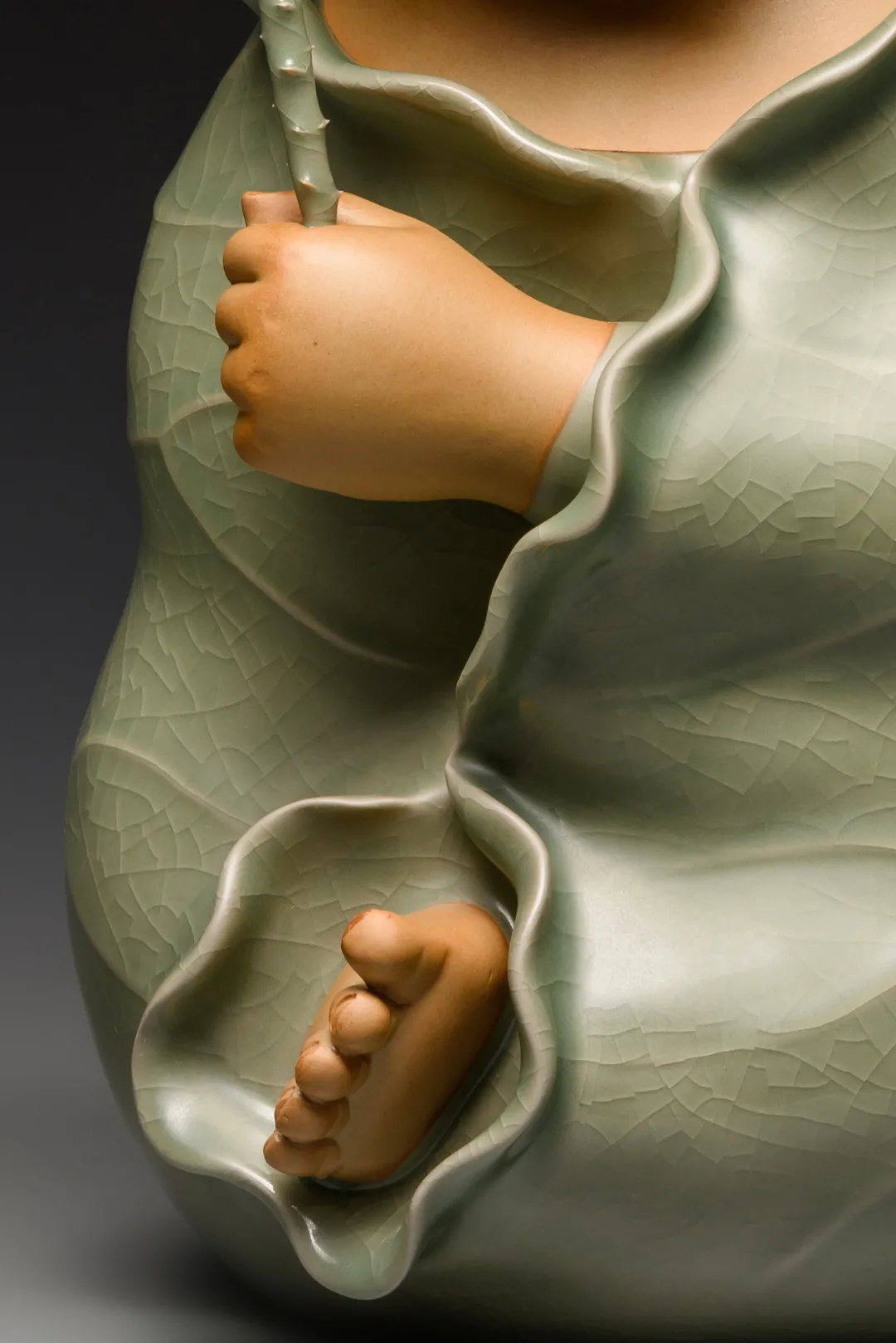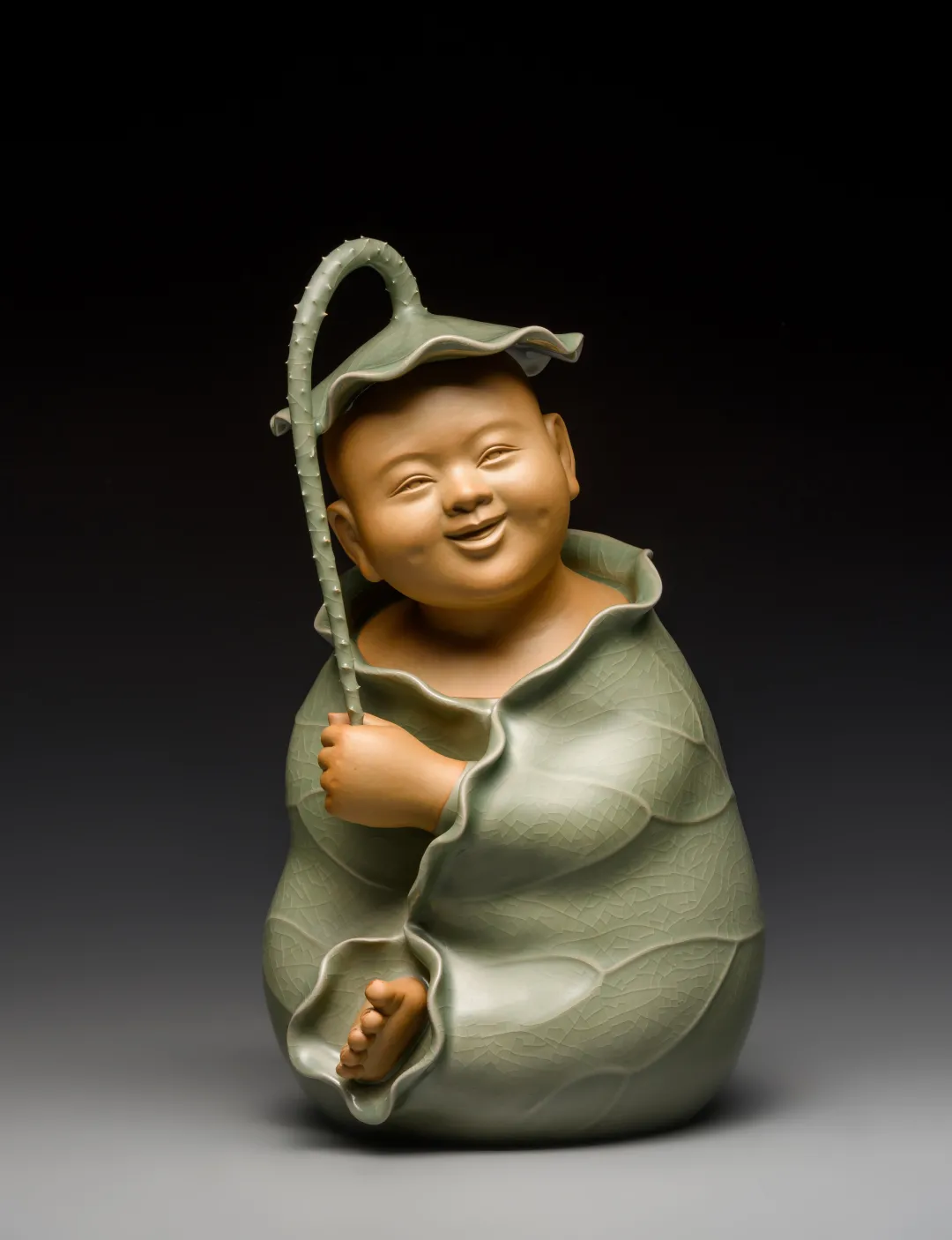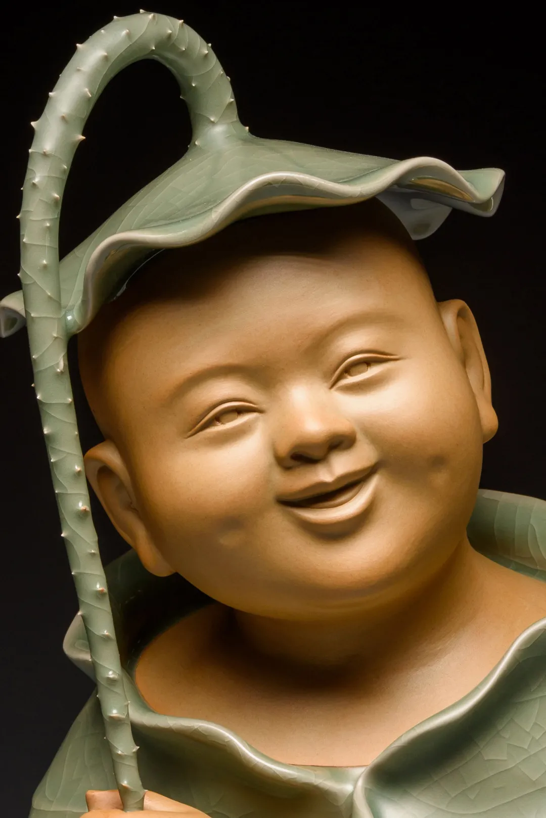 作品以中国农村小孩游戏为题材,反映改革开放四十年来,我国农村人民安居乐业,生活富足,社会和谐,欣欣向荣的景象。作品采用肤色泥新技术制作而成,利用捏塑、雕塑等手法,面部、手和足不再施釉,将人物的动作表情、内心世界更清晰生动的表现出来,造型优美,釉色纯净温润。
