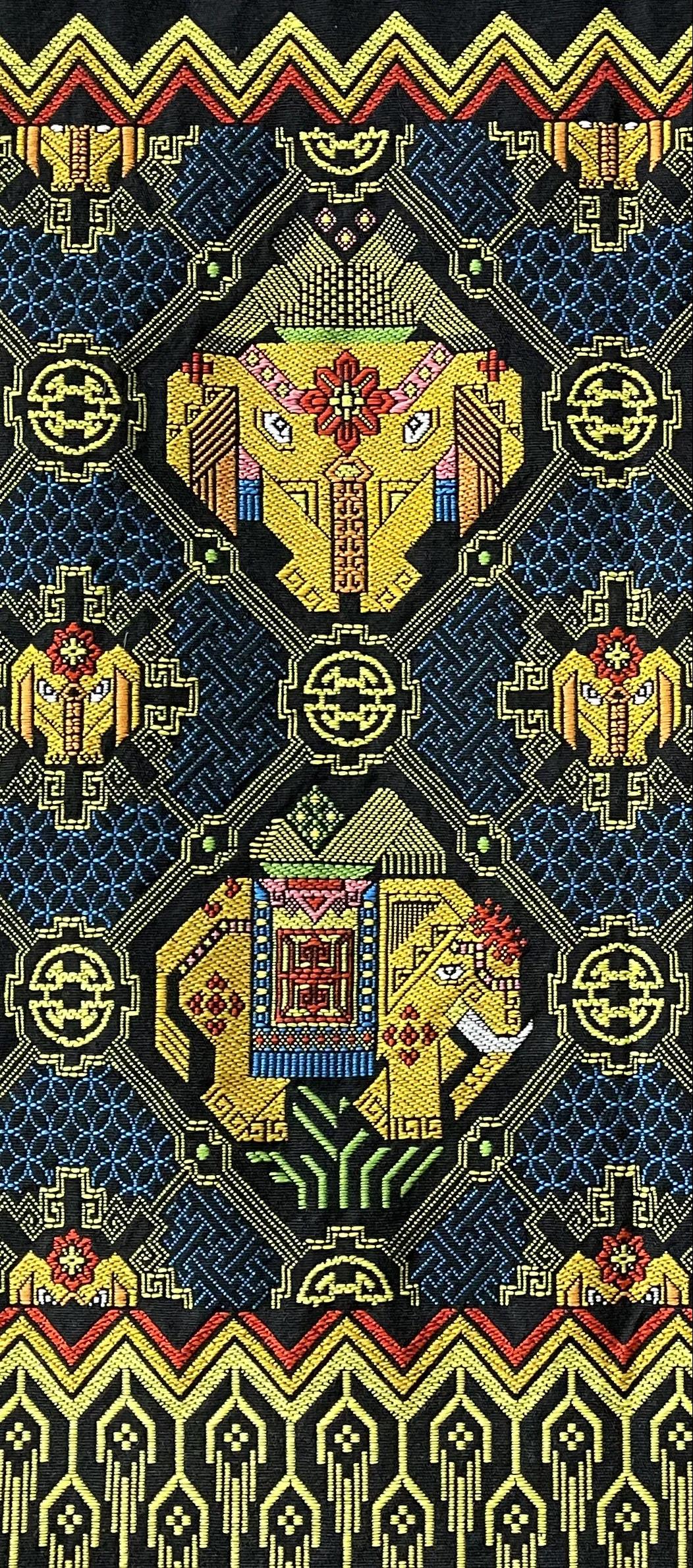 壮锦,与云锦、蜀锦、宋锦并称中国四大名锦,据传起源于宋代,是中华民族文化瑰宝。作品利用棉线、丝线纯手工编织而成,制作精美,图案生动,结构严谨,色彩斑斓,充满热烈、开朗的壮民族格调。