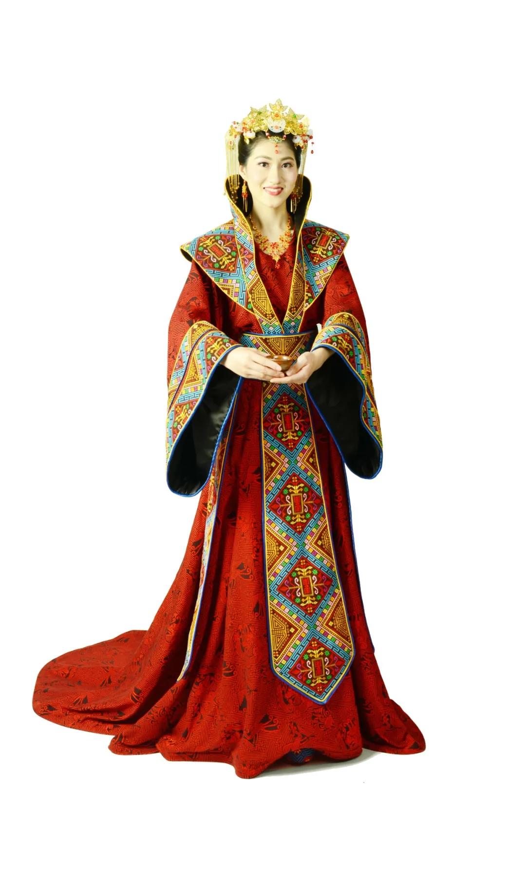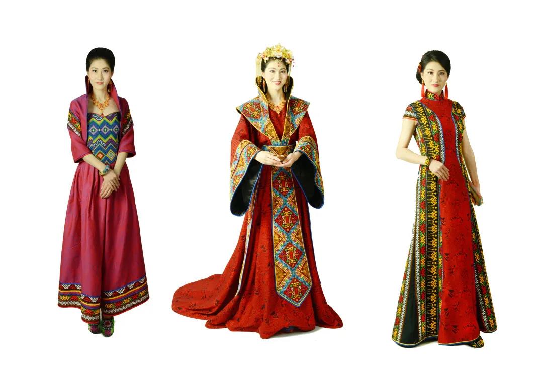 作品采用醇厚古朴、色彩斑斓的壮锦,以婚礼、婚宴为应用场景,设计制作而成。服装风格或典雅素净,或雍容华贵。服装上绣壮锦“万寿花”、“龙凤纹” 等纹样,寓意着吉祥如意、福泰安康。作品将传统壮锦与现代时尚相融合,复古中彰显奢华与唯美,呈现出独特的民族风貌。