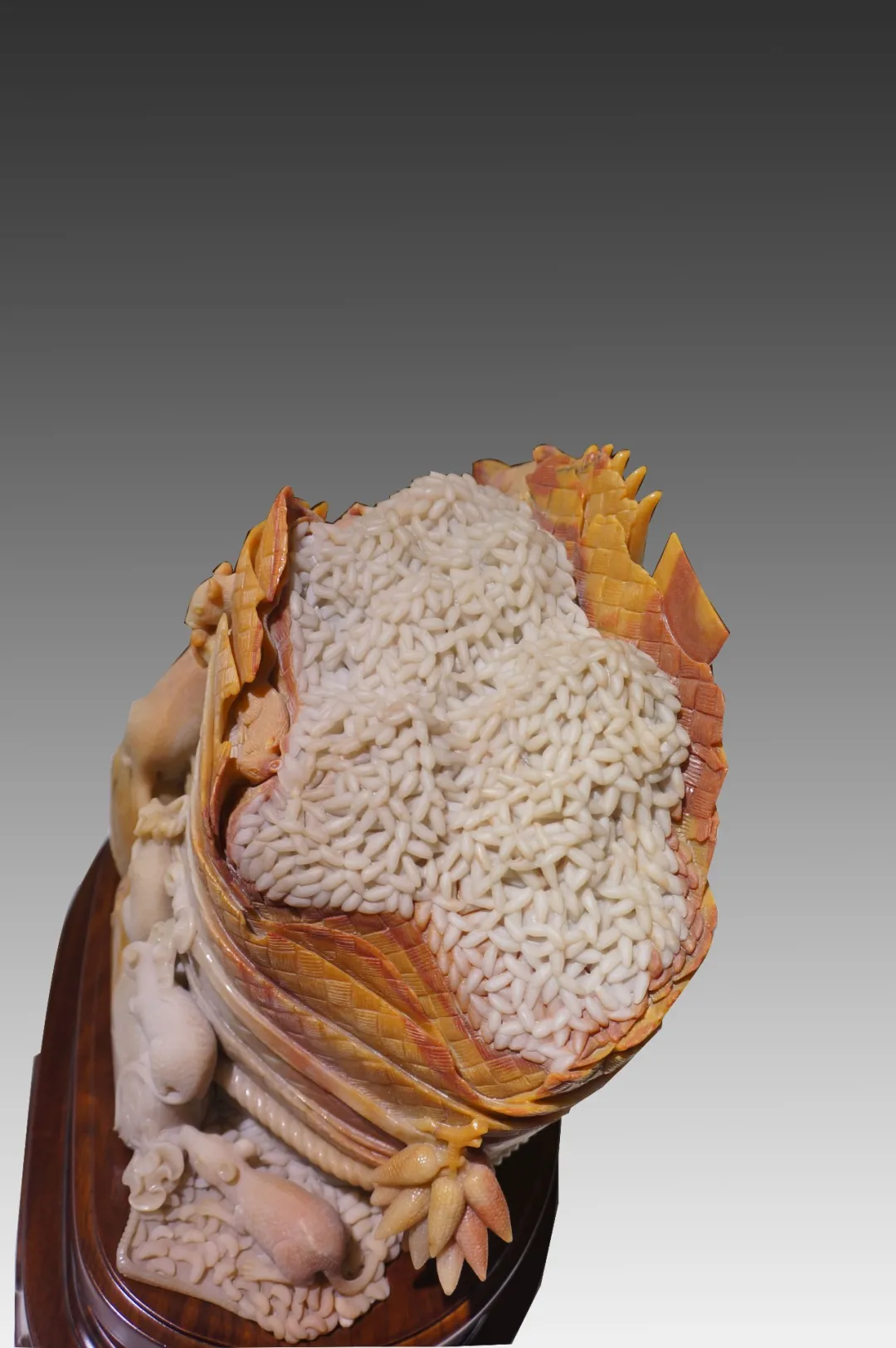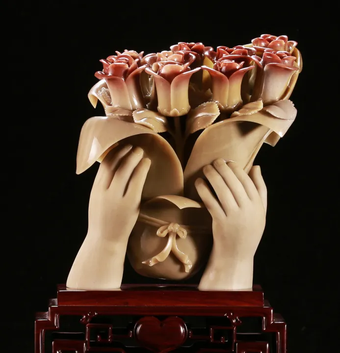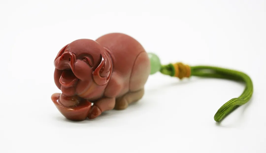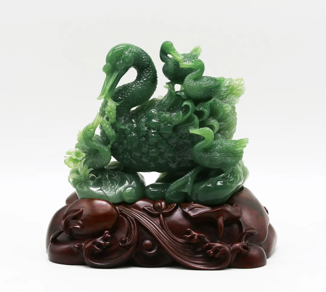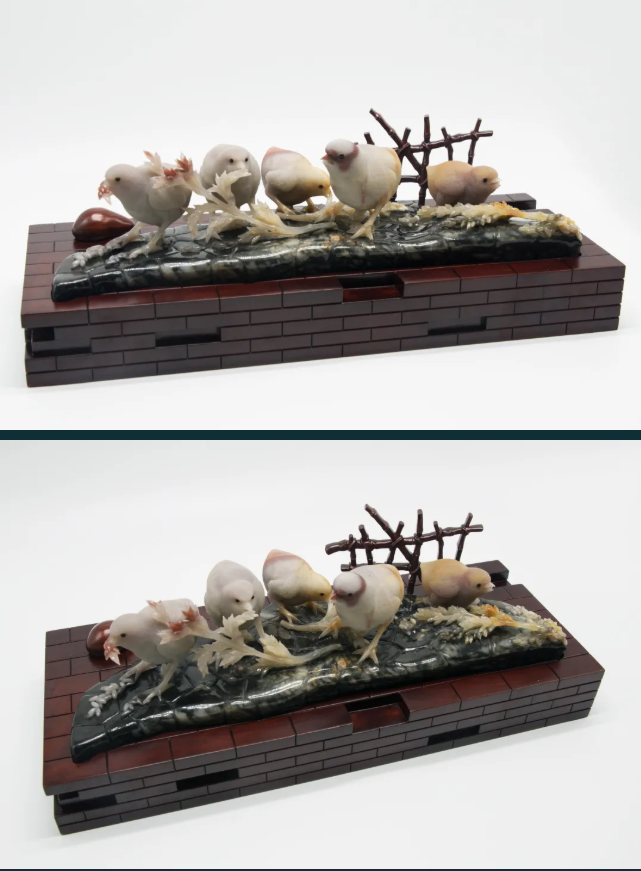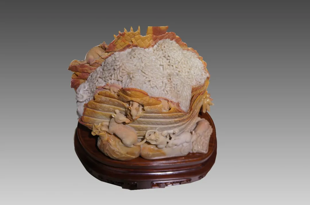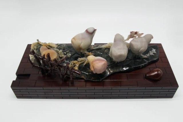 作品巧妙利用红、黄、白三色俏色密玉,将红色部分雕刻为衣着服饰,将黄色部分雕刻为鸡和鸭,色彩运用合理恰当,富有浓厚的乡土气息。作品创作灵感来源于经典民谣《回娘家》,“身穿大红袄,头戴一枝花,胭脂和香粉她的脸上擦,左手一只鸡,右手一只鸭,身上还背着一个胖娃娃”,充分刻画出广大劳动人民对美好生活的淳朴向往和乐观向上的生活态度。