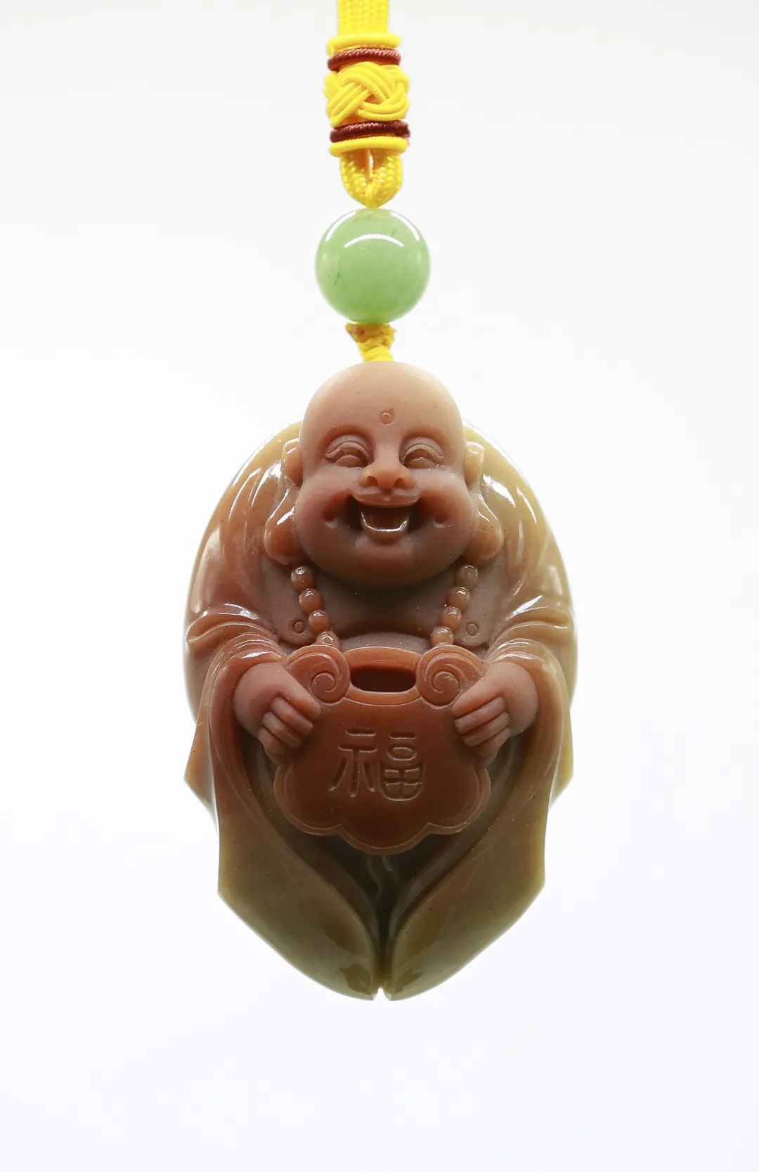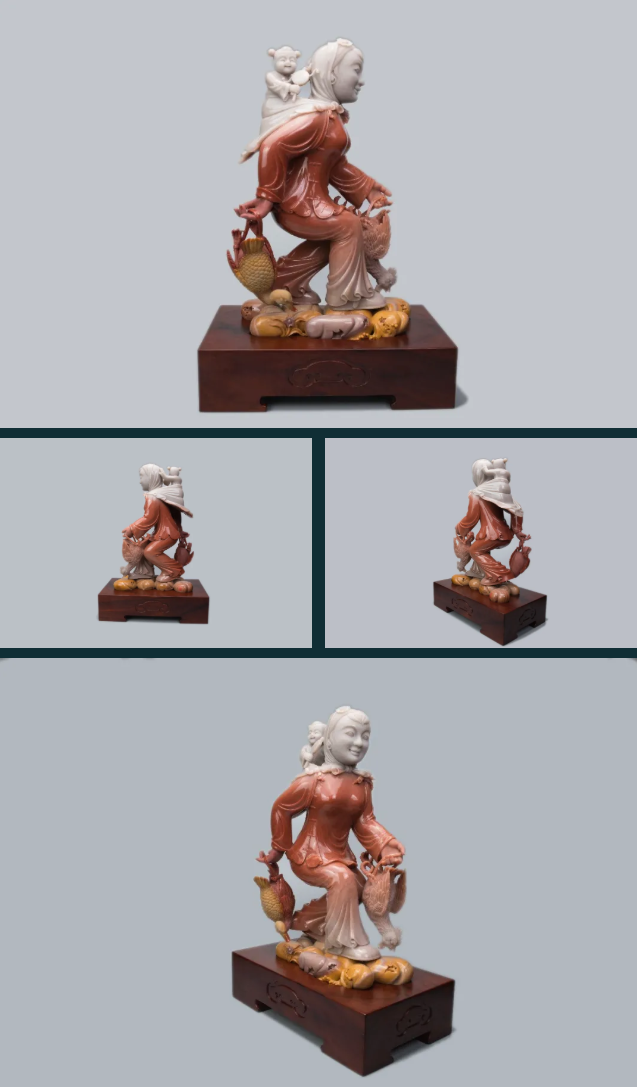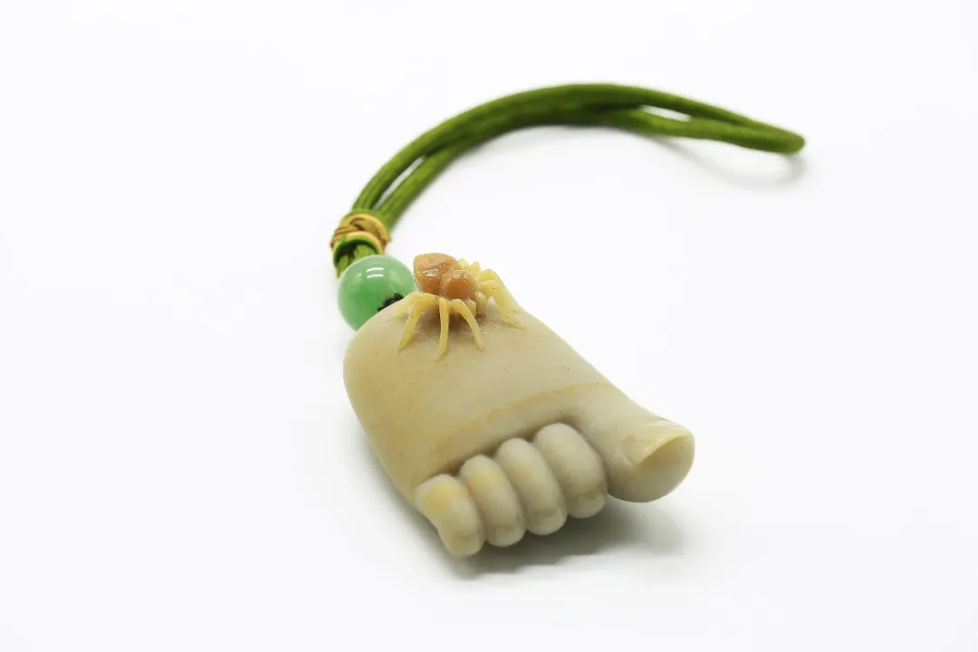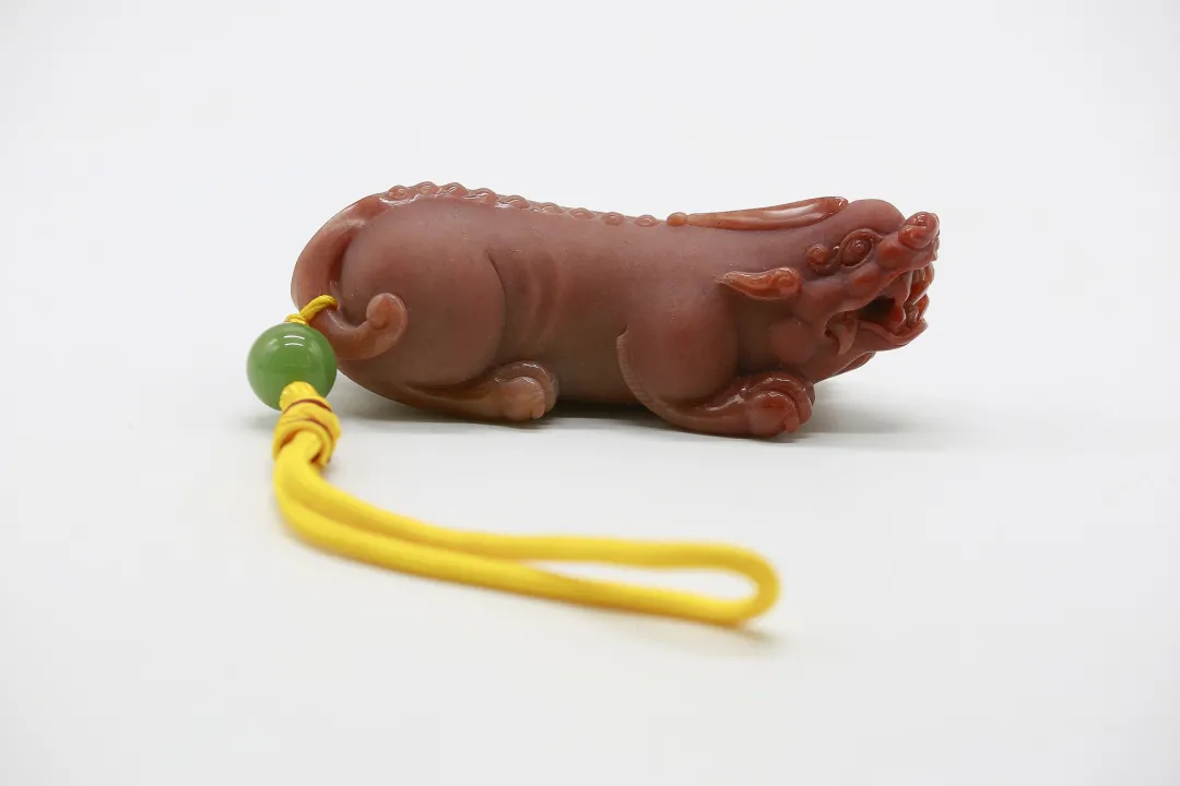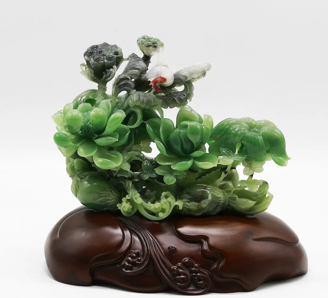 作品巧妙利用红、黄、白三色俏色密玉,将红色部分雕刻为衣着服饰,将黄色部分雕刻为鸡和鸭,色彩运用合理恰当,富有浓厚的乡土气息。作品创作灵感来源于经典民谣《回娘家》,“身穿大红袄,头戴一枝花,胭脂和香粉她的脸上擦,左手一只鸡,右手一只鸭,身上还背着一个胖娃娃”,充分刻画出广大劳动人民对美好生活的淳朴向往和乐观向上的生活态度。