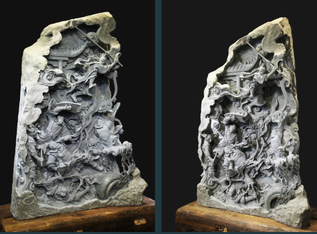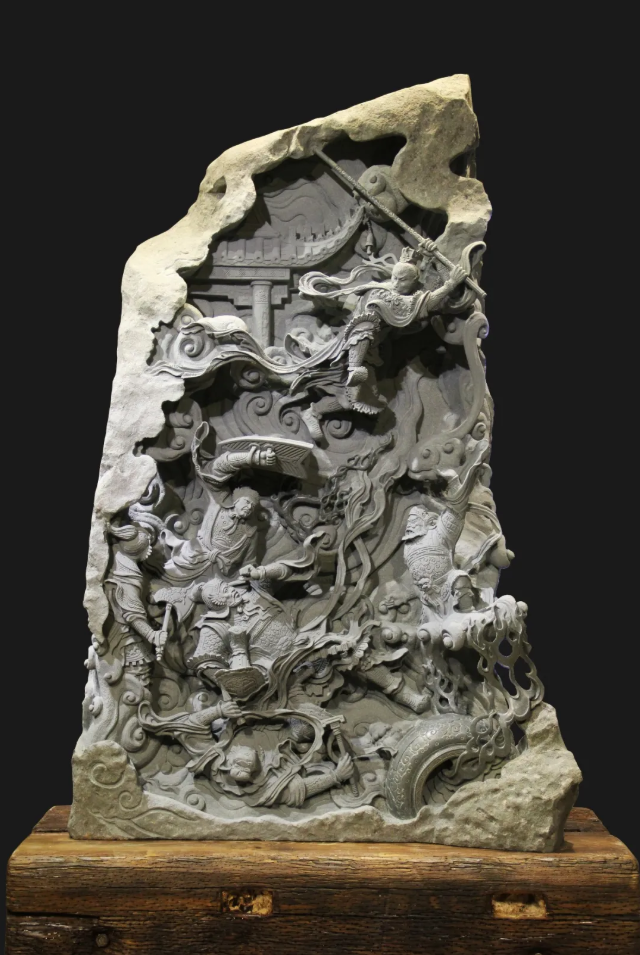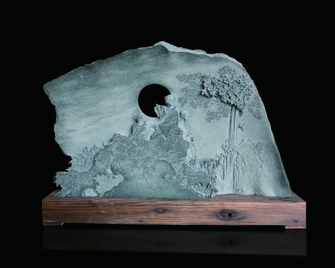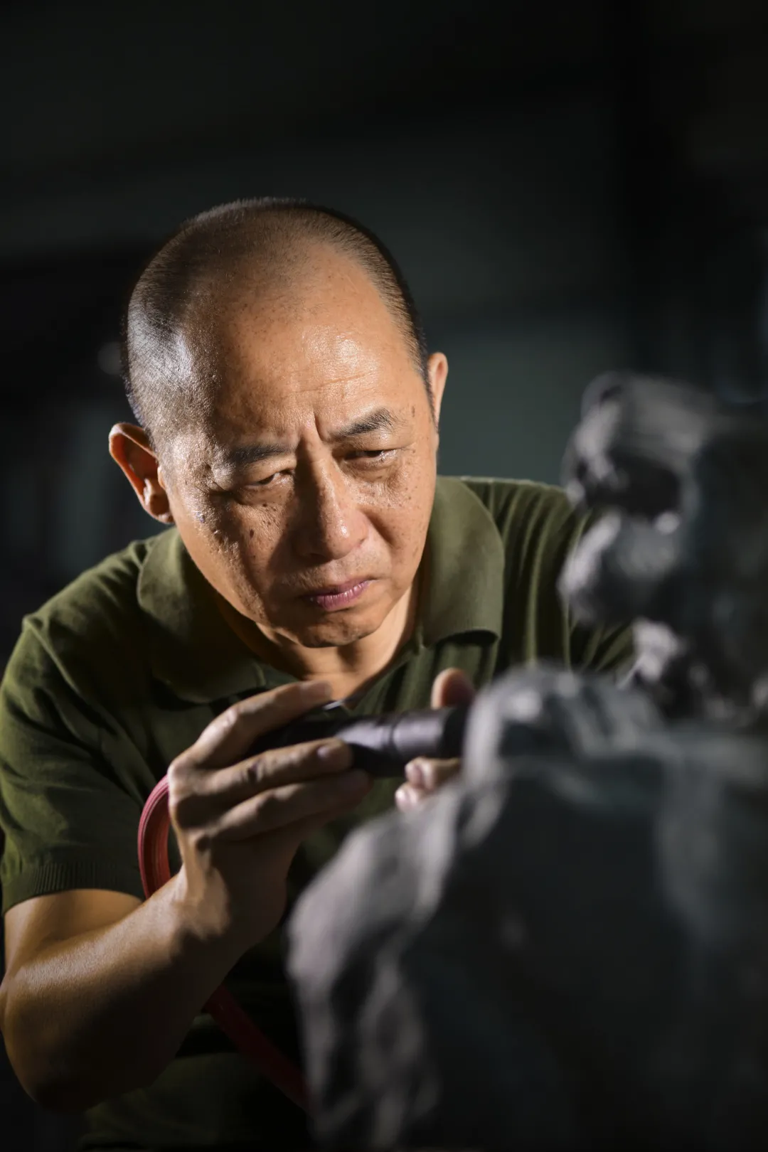 从青石、汉白玉到寿山石,王经民大师作品充分顺应石材形状、纹理等天然特性,师法自然。青石、汉白玉雕刻擅用“黑白针”技法,使得单一颜色的石材呈现出不同着色效果,色单而形不单,层次分明,极富立体感。寿山石雕刻巧用俏色,满而不溢,绷而不断,构图错落有致,疏密得当,呈现出方中有圆,意气风发的艺术效果。其作品题材丰富多样,既有传统的追述,也有时代的展现。商周的禽兽面纹,秦汉的功臣烈女、神仙百戏,隋唐的莲纹卷草、佛道器物,宋元的农商世态、灵怪传说,明清的龙凤祥瑞、戏文博古,现实题材的中国魂、惠安女等,在王经民大师的精雕细琢中,汇成世间百态。