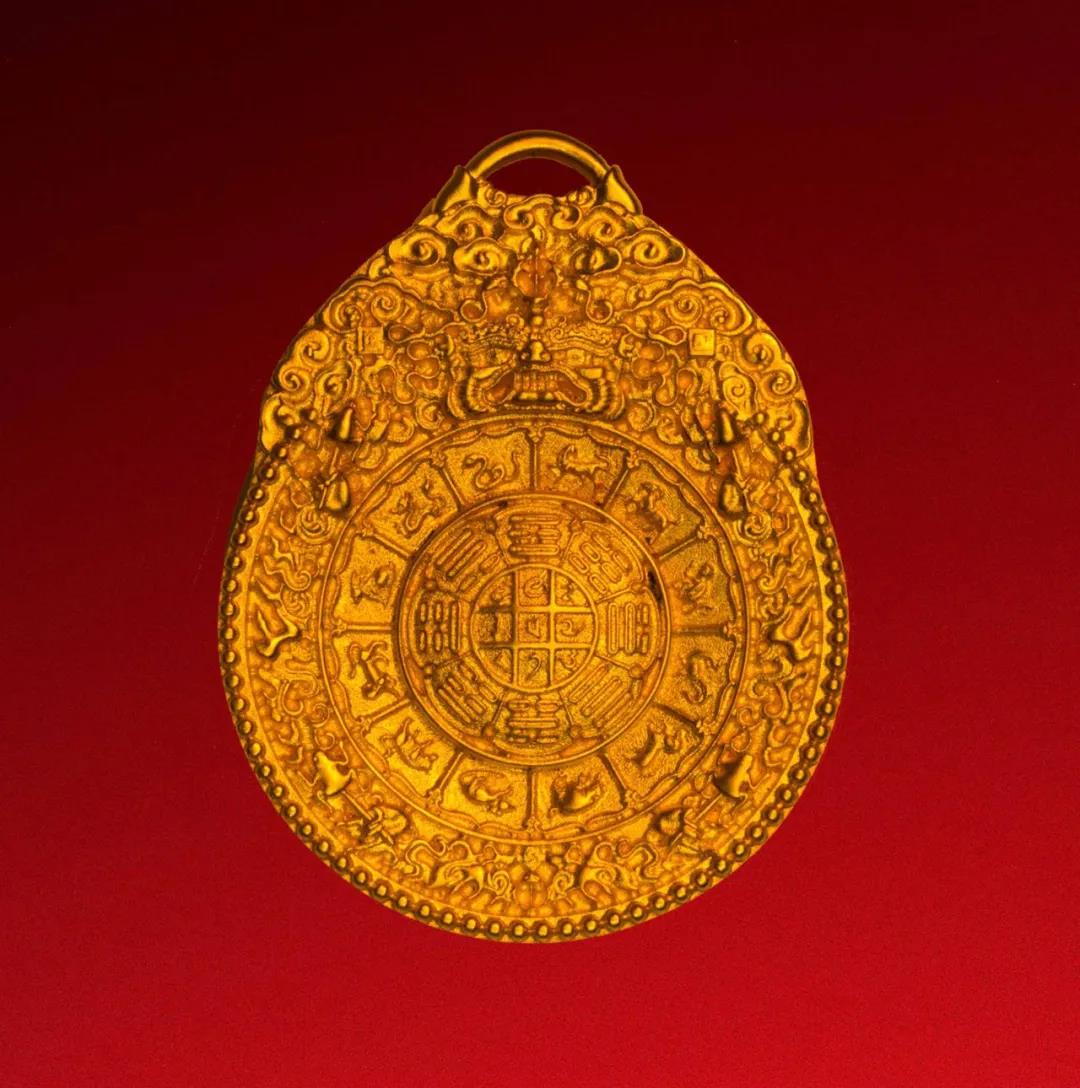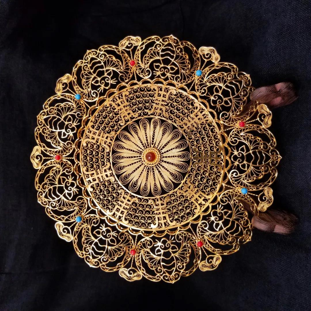 九福捧寿是中国民间广为流传的一种传统吉祥图案,由九只蝙蝠围着寿字构成,蝙蝠围在寿字周围,寓意多福多寿。利用花丝镶嵌技艺中垒丝、填圈工艺,全手工精制而成,结构严谨,精巧灵动,充分体现了津派花丝镶嵌技艺。