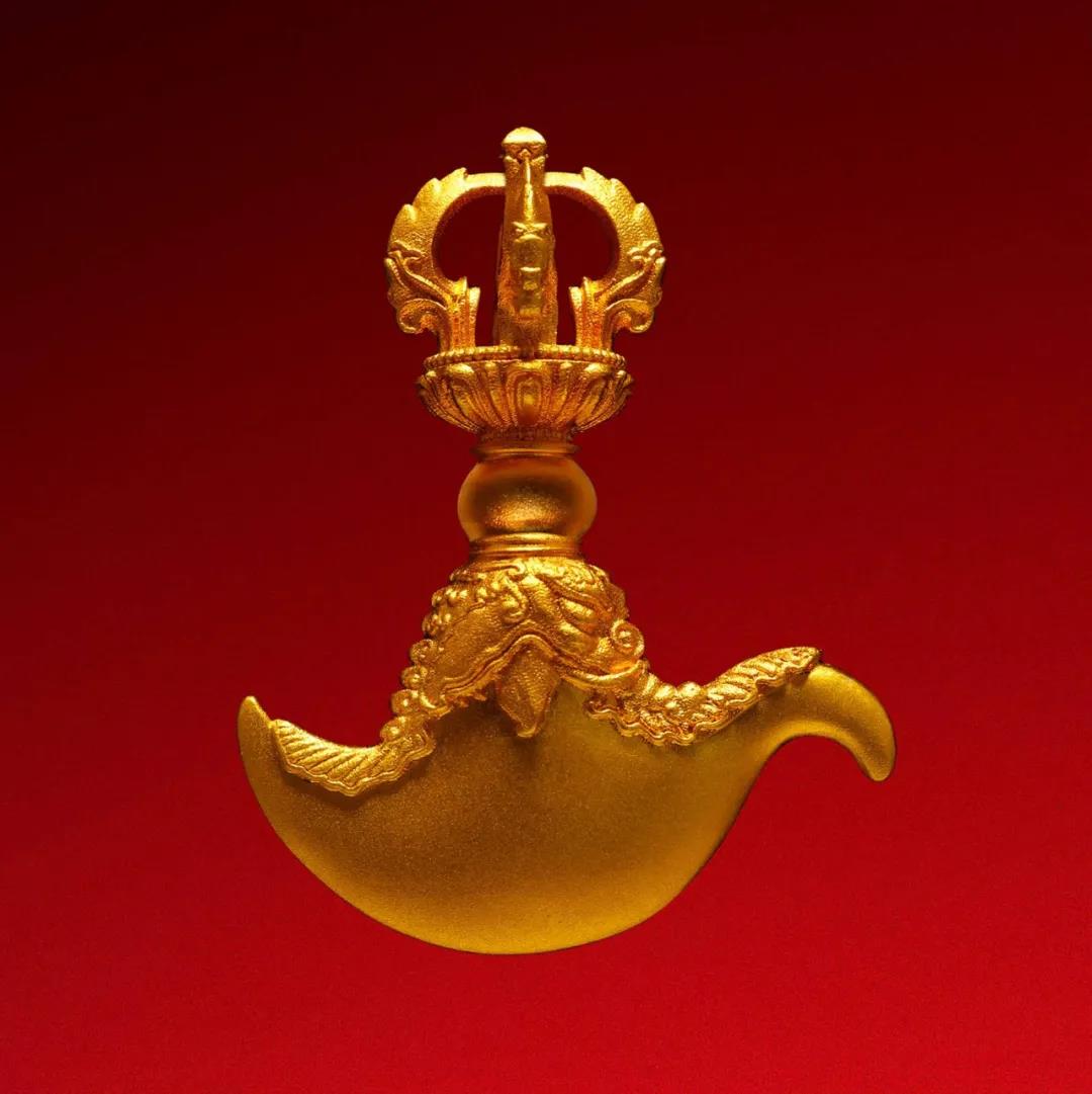 材质:银镀金 尺寸:高30cm宽20cm 重量约:1500克 五佛冠是佛教仪轨中像徵五智如来的宝冠,这件法器是银质镀金而成,采用花丝,镶嵌、錾刻等多种工艺加工而成,由五智如来和十字金刚杵等组成,工艺极为复杂。五佛冠又作五佛宝冠、五智宝冠、五宝天冠、灌顶宝冠等。因其中有五方佛形象,用以表示诸佛五智圆满之德,故得此名。佛教在修法时,往往需要佩戴五佛宝冠。此顶五佛冠共有6片冠叶,冠叶中间皆有一个佛龛,佛龛中安置五方佛等图案,表示五智圆满之德。顶部端坐大日如来,安放于十字金刚杵之上。整冠为镂空镶嵌金丝工艺,实为不可多得的佛教圣物。