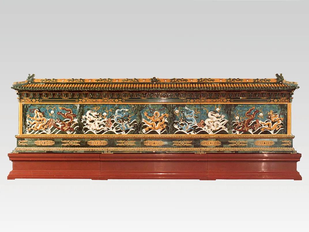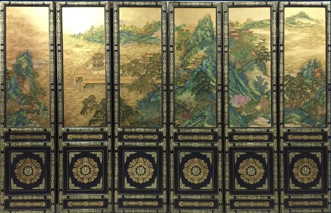 作品创意出自宋代诗人苏轼的《东坡志林·三老语》,造型为通景六扇屏,下有开光,以天然大漆为原料,以断纹技艺和“金髹淡彩”工艺装饰制作而成。用工考究,做工精细,色彩丰润。屏风运用断纹工艺,在漆地之上制作均匀细密的裂纹,给人以饱经沧桑后自然形成之感。屏风在金地之上彩绘青山绿水、亭台楼阁,犹如工笔重彩,典雅雍秀,富丽堂皇。