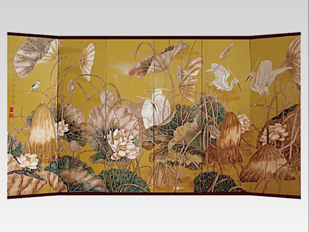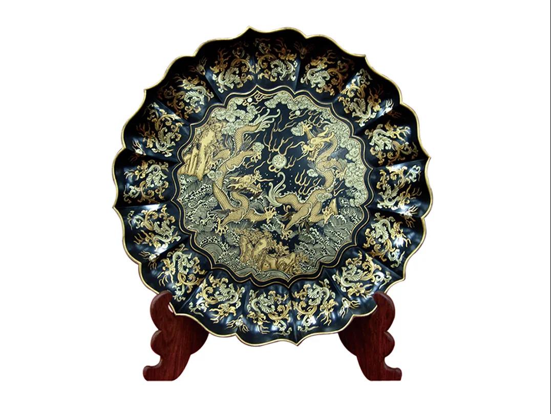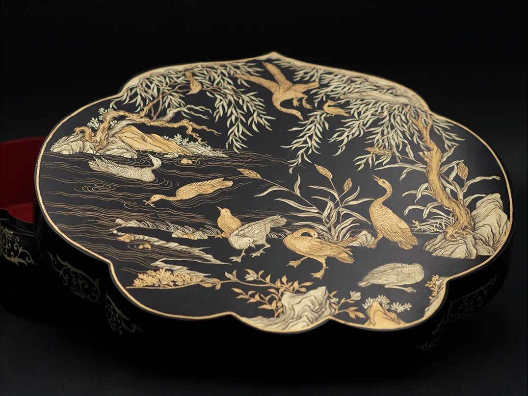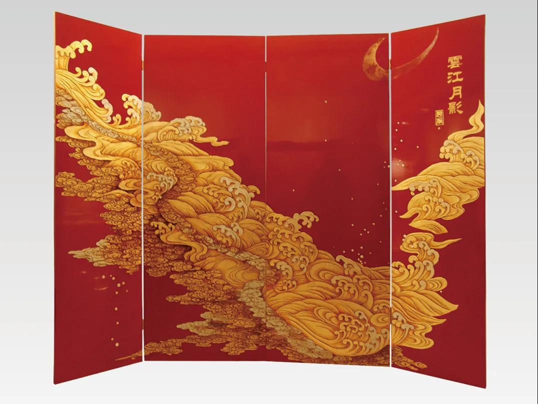 万紫大师作品题材广泛,用料讲究,器型多变,工巧材美,颇具匠心。屏风、条案、提盒、挂屏、圆盘、漆箱、漆壶等,皆以金漆镶嵌技艺髹饰,融传统制作工艺和现代设计理念,或浓墨重彩,富丽堂皇,延承宫廷风格,尽显皇家气象;或典雅隽秀,质朴简约,颇具现代格调。作品似画非画而更胜于画,一砖一瓦,一草一木,行刀流畅细腻,细节刻画精准到位;一言一动,一颦一笑,人物神情姿态描摹生动形象,惟妙惟肖;苍松翠柏,牡丹玫瑰,亭台楼阁,湖光山色,或明或暗,或远或近,错落有序,凹凸有致,层次分明,透视效果强,极富立体感。万紫大师凭借着这一刀一刻、一描一贴,使山水花鸟、万千人物和古今往事,焕发出无限光彩和新的生机。