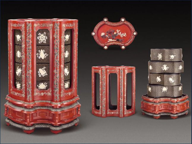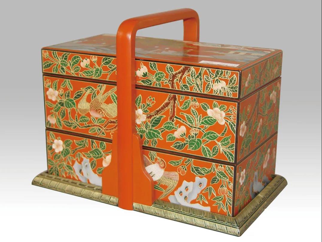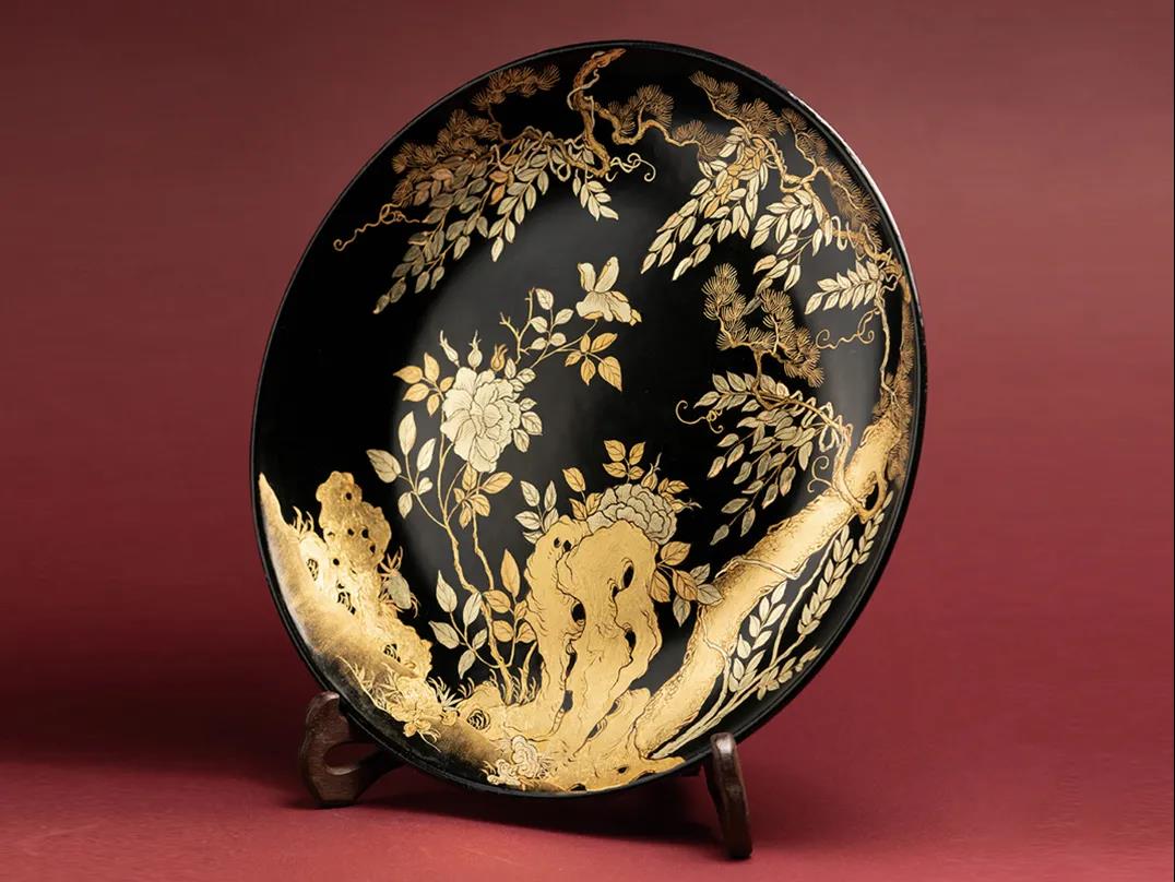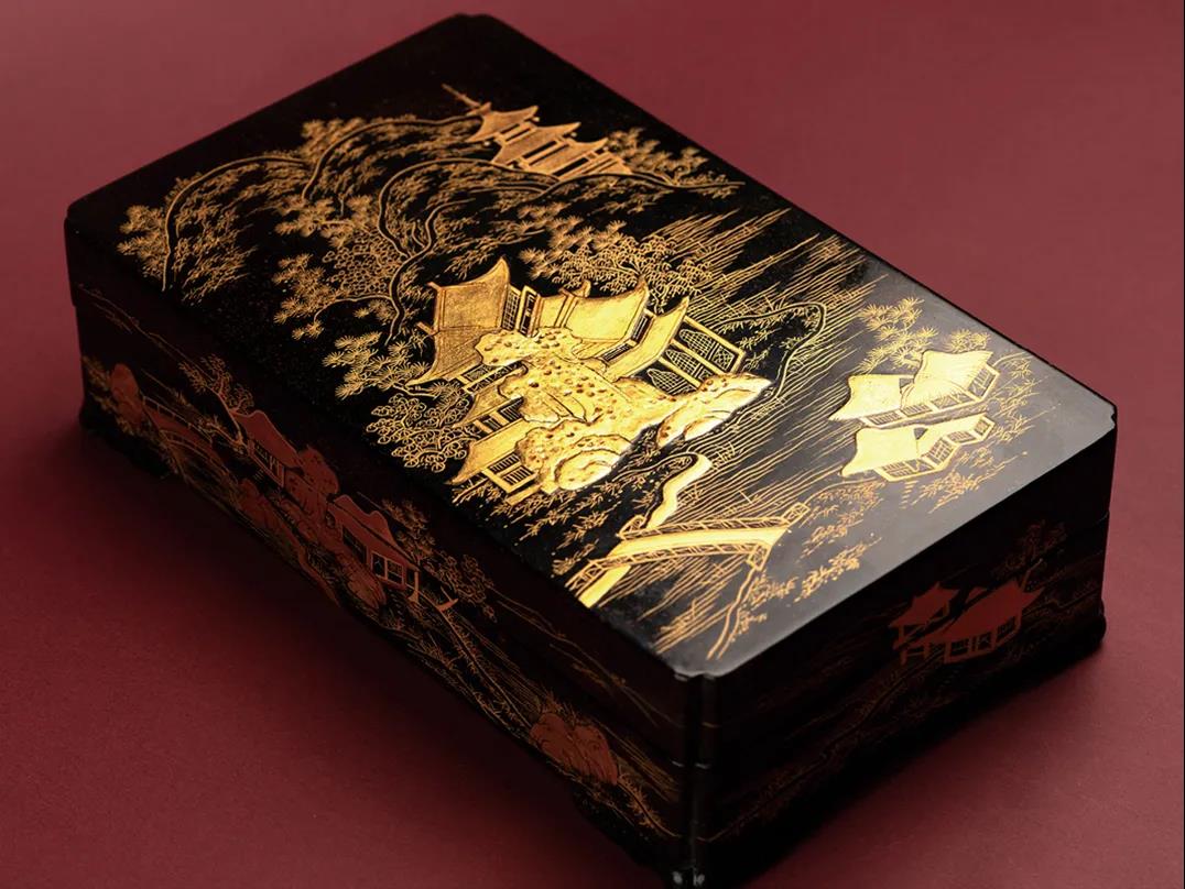 万紫大师作品题材广泛,用料讲究,器型多变,工巧材美,颇具匠心。屏风、条案、提盒、挂屏、圆盘、漆箱、漆壶等,皆以金漆镶嵌技艺髹饰,融传统制作工艺和现代设计理念,或浓墨重彩,富丽堂皇,延承宫廷风格,尽显皇家气象;或典雅隽秀,质朴简约,颇具现代格调。作品似画非画而更胜于画,一砖一瓦,一草一木,行刀流畅细腻,细节刻画精准到位;一言一动,一颦一笑,人物神情姿态描摹生动形象,惟妙惟肖;苍松翠柏,牡丹玫瑰,亭台楼阁,湖光山色,或明或暗,或远或近,错落有序,凹凸有致,层次分明,透视效果强,极富立体感。万紫大师凭借着这一刀一刻、一描一贴,使山水花鸟、万千人物和古今往事,焕发出无限光彩和新的生机。