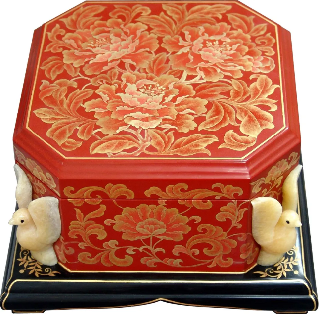 作品以牡丹与和平鸽为题,四周装饰和平鸽雕刻造型,与传统牡丹纹样相结合,表达祈求和平的寓意。饰面采用金漆镶嵌传统技法之金髹描绘、晕金和扫金工艺制作,描画精致细腻,金箔光亮,晕染娴熟,做工精湛,色彩艳丽。