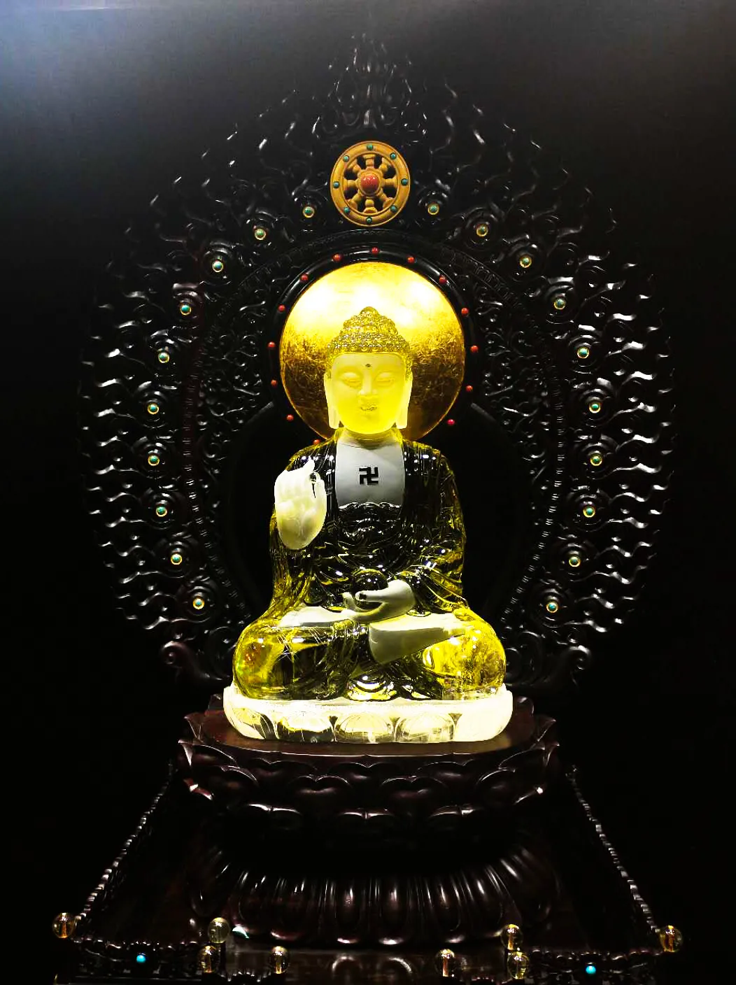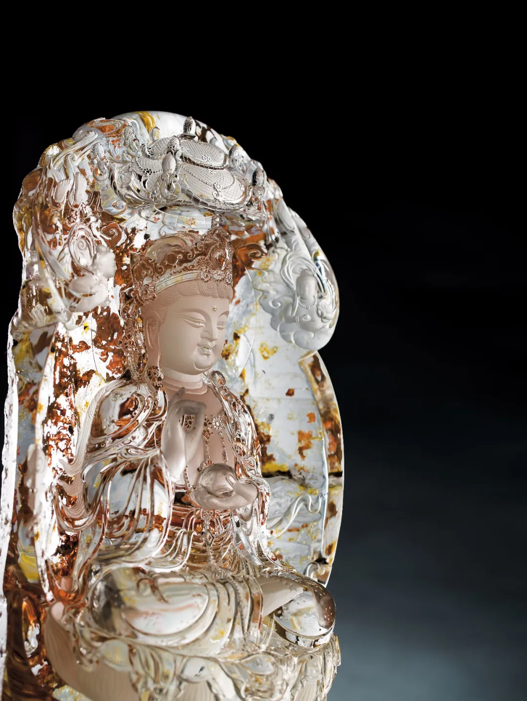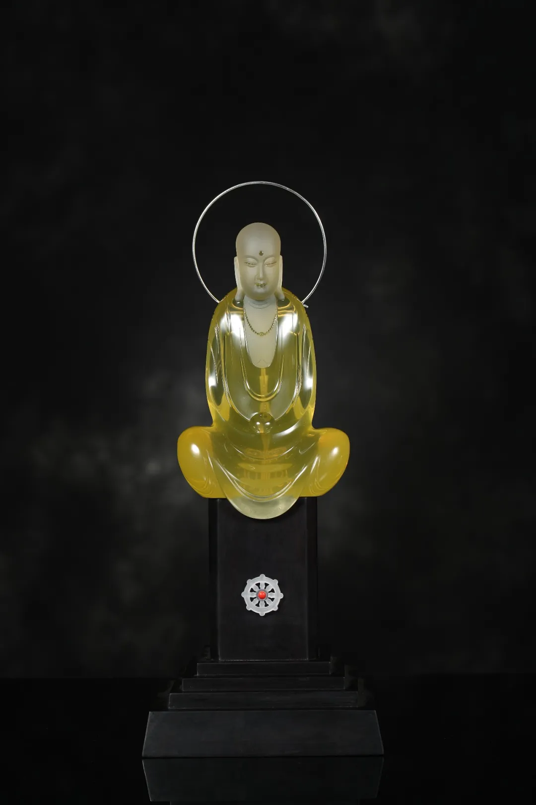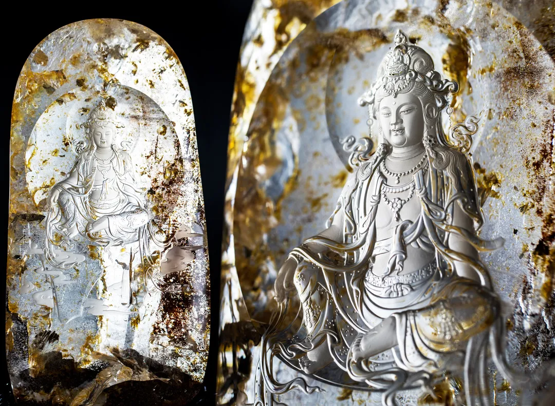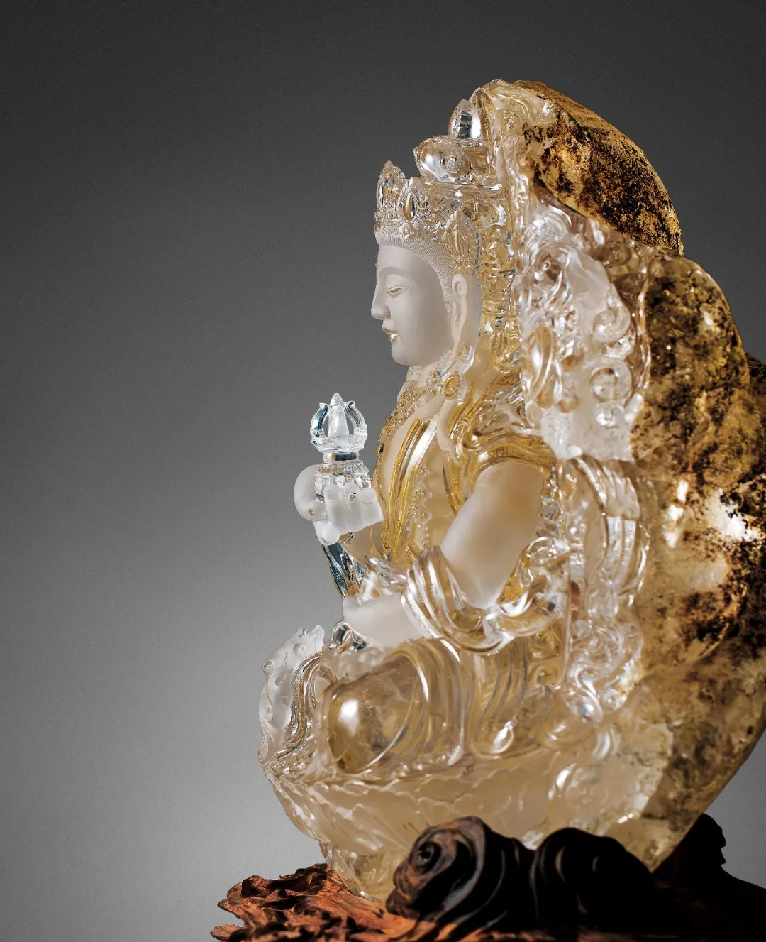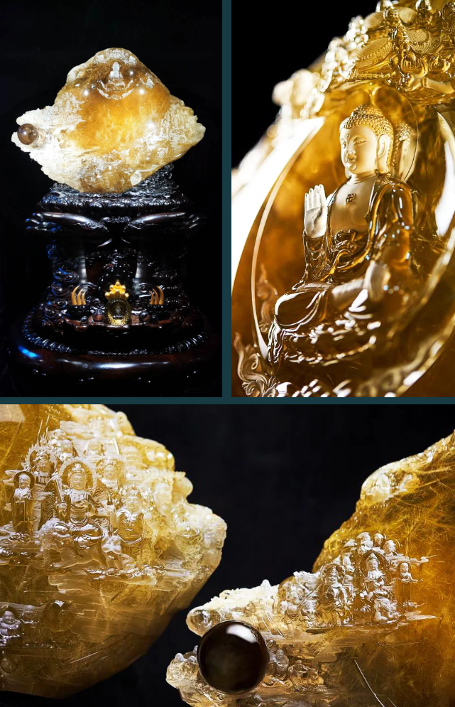 作品由天然金发黄水晶琢磨而成,水晶原料中缕缕金发如冰晶花一般,昂烈绽放,激扬璀璨,光华悦目。作品整体高233cm,宽60cm,厚50cm,是河南省应汶玉文化研究院全院研创人员耗时16年的倾心巨作,灵感取自佛教盛典“灵山法会”。作品将琢磨技艺与自然晶灵完美契合,刻画的菩萨、灵童,或肃穆站立,或怡然盘坐,或经行辩机,或嬉戏斗禅,皆是笑意融融,展现出东方文化艺术的深远意境。